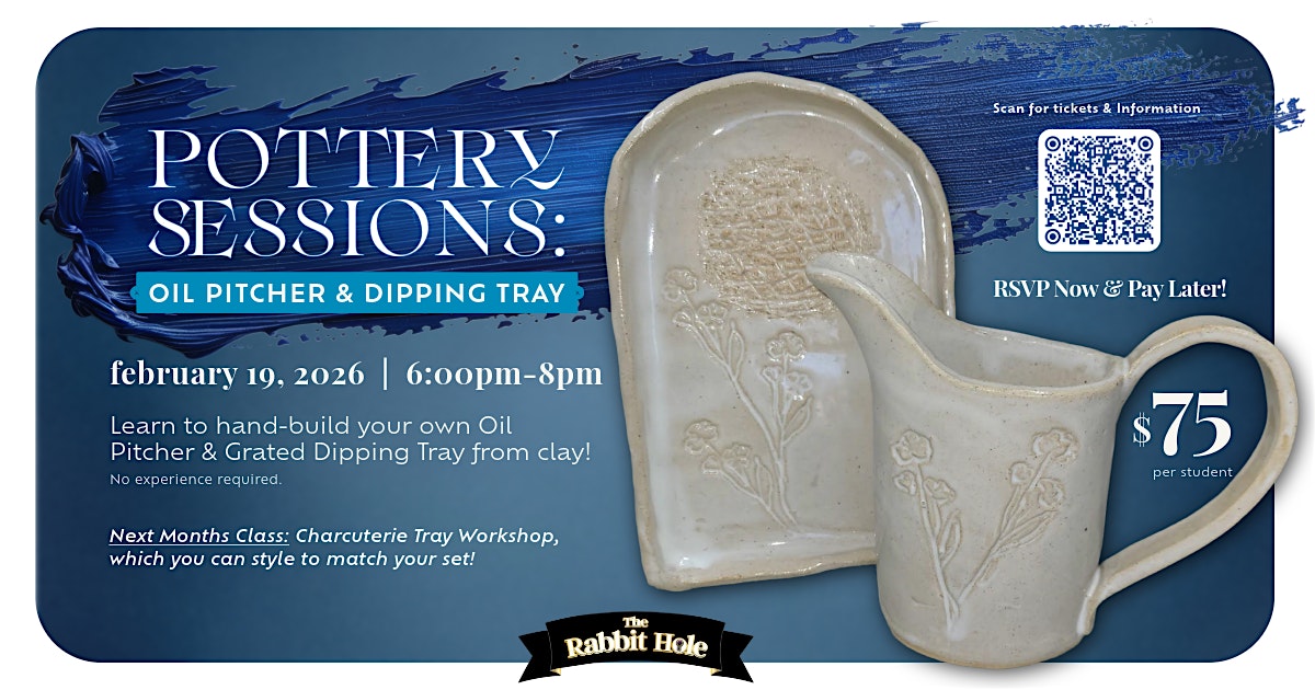 by admin12Feb Pottery Sessions: Oil Pitcher & Tray at The Rabbit Hole Gifts – Newton, NC Pottery Sessions: Oil Pitcher & Tray at The Rabbit Hole Gifts – Newton, NC 3 3 people viewed this event. Teresa teaches the art of beautiful and useful clay tableware creations in Pottery Sessions: Build an Oil Pitcher & Tray! Tickets-RSVP Link Date And Time Thursday, February 19th, 2026 11:00 PM (PST) Venue The Rabbit Hole Gifts Location 24 East 1st Street, Newton, NC 28658 Event Category North Carolina Share With Friends Facebook Twitter Linkedin Xing Pinterest Share This Post: