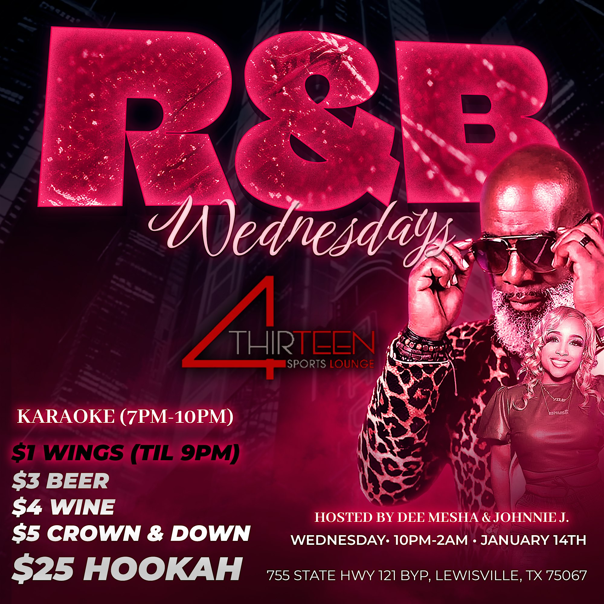by admin12Feb R&B Wednesdays at 4Thirteen Kitchen and Sports Lounge – Lewisville, TX R&B Wednesdays at 4Thirteen Kitchen and Sports Lounge – Lewisville, TX 5 5 people viewed this event. Get ready to groove to your favorite R&B hits every Wednesday – it’s the perfect midweek pick-me-up! Tickets-RSVP Link Date And Time Thursday, February 19th, 2026 04:00 AM (PST) Venue 4Thirteen Kitchen and Sports Lounge Location 755 State Highway 121 Bypass, Lewisville, TX 75067 Event Types Concert or PerformanceMusic Event Category DallasTexas Share With Friends Facebook Twitter Linkedin Xing Pinterest Share This Post: