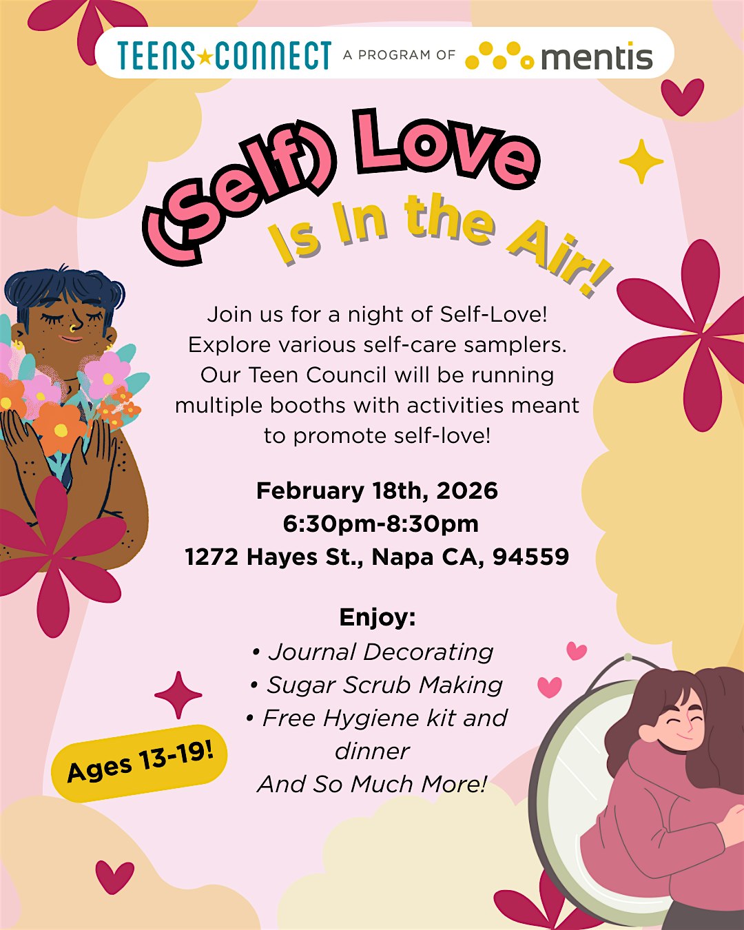 by admin12Feb Self-Love Is In The Air! at Mentis Wellness Campus – Napa, CA Self-Love Is In The Air! at Mentis Wellness Campus – Napa, CA 3 3 people viewed this event. Join us for a night of Self-Love! Our Teen Council will be hosting different booths with self-love activities! Tickets-RSVP Link Date And Time Thursday, February 19th, 2026 02:00 AM (PST) Venue Mentis Wellness Campus Location 1272 Hayes Street, Napa, CA 94559 Event Types Party or Social Gathering Event Category California Share With Friends Facebook Twitter Linkedin Xing Pinterest Share This Post: