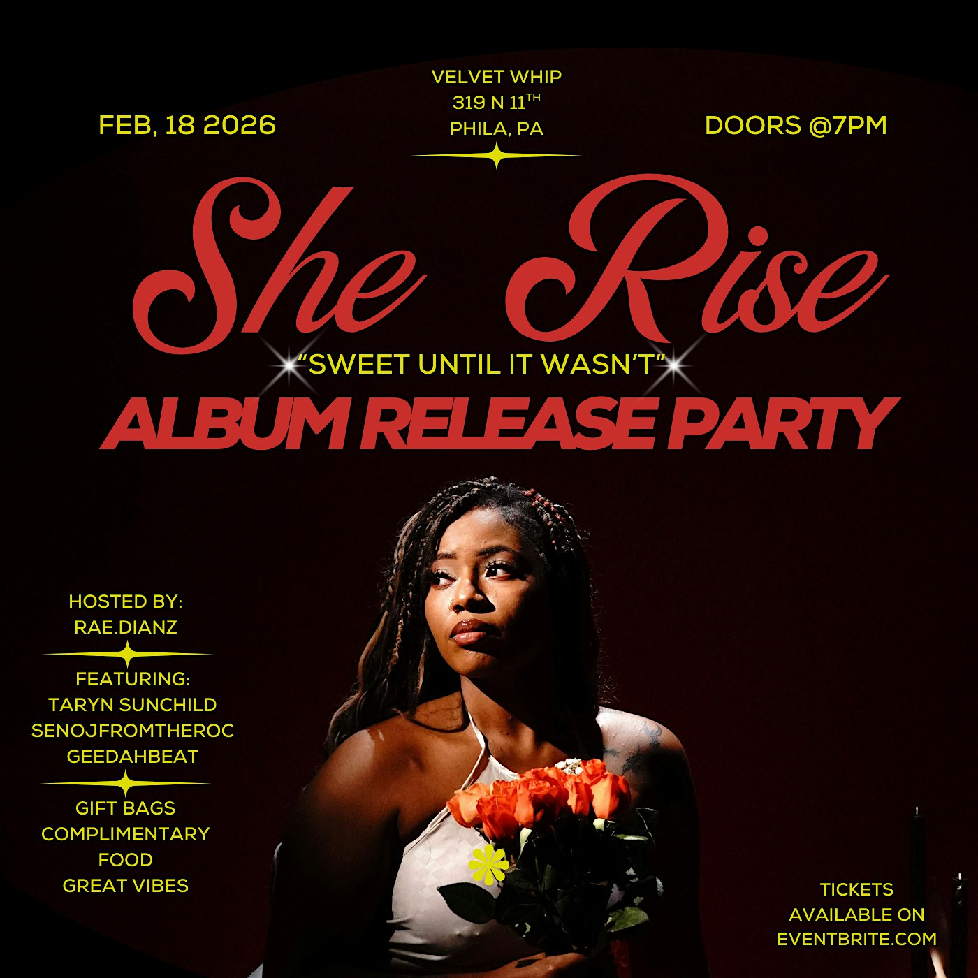by admin12Feb SheRise Album Release Party • February 18 • Philadelphia at Velvet Whip Arts & Social Club – Philadelphia, PA SheRise Album Release Party • February 18 • Philadelphia at Velvet Whip Arts & Social Club – Philadelphia, PA 5 5 people viewed this event. Join SheRise live on Feb 18 for her official album release. One night only. Limited seating. Get your tickets now. Tickets-RSVP Link Date And Time Thursday, February 19th, 2026 12:00 AM (PST) Venue Velvet Whip Arts & Social Club Location 319 North 11th Street, Philadelphia, PA 19107 Event Types MusicParty or Social Gathering Event Category PennsylvaniaPhiladelphia Share With Friends Facebook Twitter Linkedin Xing Pinterest Share This Post: