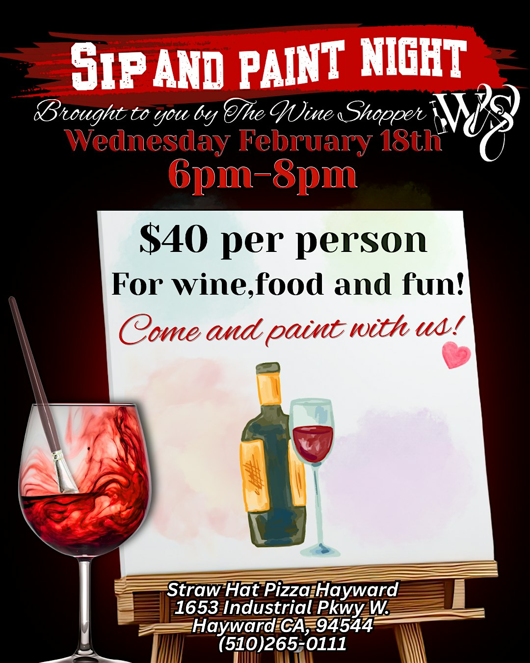 by admin12Feb Sip and Paint Night at Straw Hat Pizza – Hayward, CA Sip and Paint Night at Straw Hat Pizza – Hayward, CA 4 4 people viewed this event. Join us for an evening of fun,food,art and wine! $40 per person for a wine tasting, meal and art supplies for the painting activity. Tickets-RSVP Link Date And Time Thursday, February 19th, 2026 02:00 AM (PST) Venue Straw Hat Pizza Location 1653 Industrial Parkway West, Hayward, CA 94544 Event Types Food & Drink Event Category CaliforniaOakland Share With Friends Facebook Twitter Linkedin Xing Pinterest Share This Post: