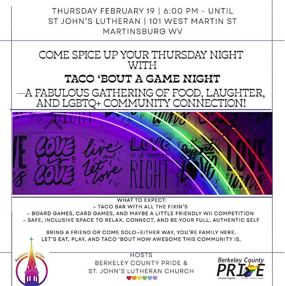 by admin12Feb Taco ‘Bout a Game Night at 101 W King St – Martinsburg, WV Taco ‘Bout a Game Night at 101 W King St – Martinsburg, WV 2 2 people viewed this event. What to expect for this FREE event: – Taco bar with all the fixin’s – Board games, card games, and maybe a little friendly Wii competition Tickets-RSVP Link Date And Time Thursday, February 19th, 2026 11:00 PM (PST) Venue 101 W King St Location 101 West King Street, Martinsburg, WV 25401 Event Types Community & CultureParty or Social Gathering Event Category West Virginia Share With Friends Facebook Twitter Linkedin Xing Pinterest Share This Post: