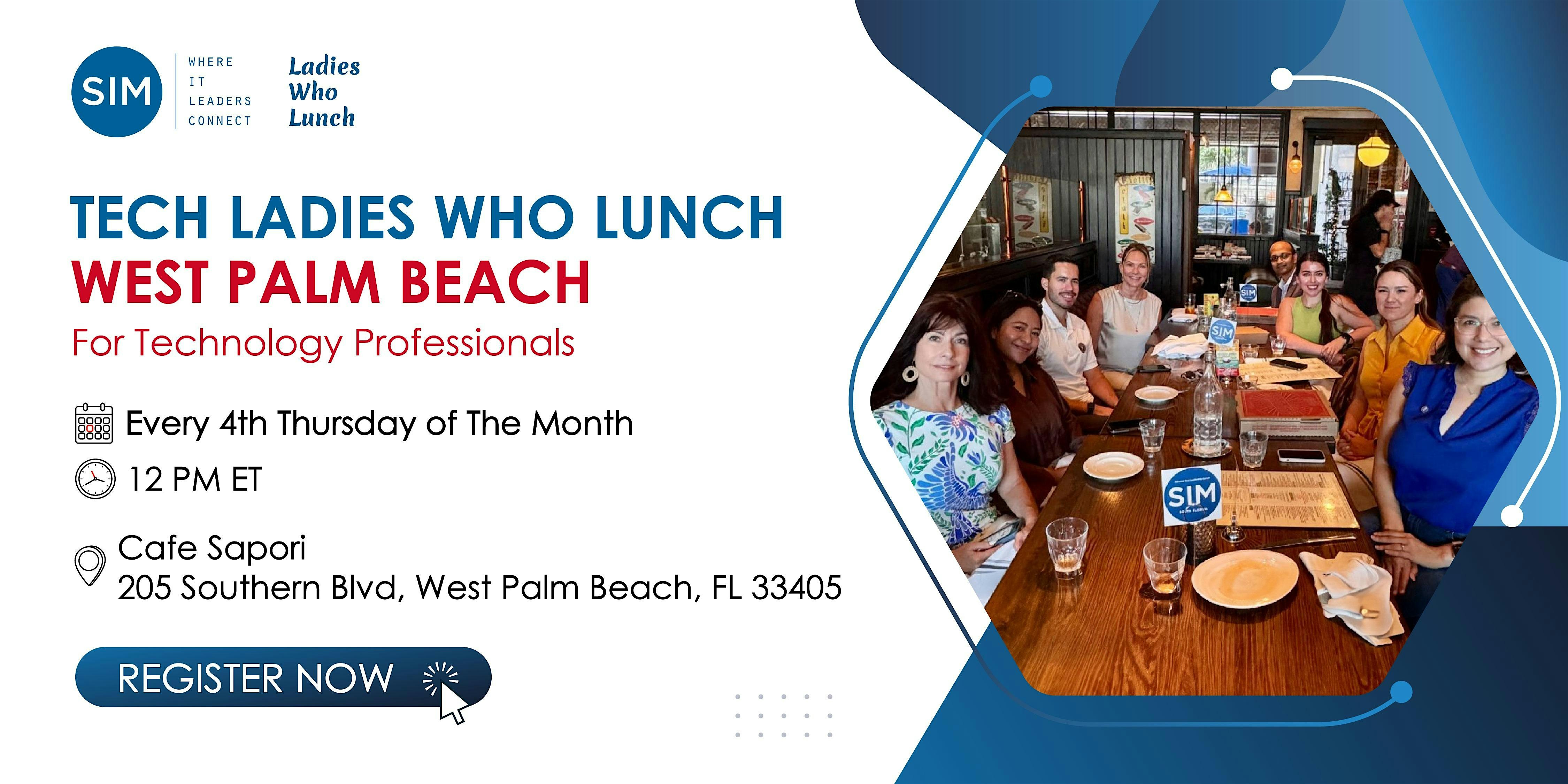by admin12Feb Tech Ladies Who Lunch – West Palm Beach at Cafe Sapori – West Palm Beach, FL Tech Ladies Who Lunch – West Palm Beach at Cafe Sapori – West Palm Beach, FL 1 1 people viewed this event. Discover SIM Women’s ‘Ladies Who Lunch’! Network, dine, and be inspired with fellow IT professionals. Tickets-RSVP Link Date And Time Thursday, February 19th, 2026 05:00 PM (PST) Venue Cafe Sapori Location 205 Southern Boulevard, West Palm Beach, FL 33405 Event Types Food & Drink Event Category Florida Share With Friends Facebook Twitter Linkedin Xing Pinterest Share This Post: