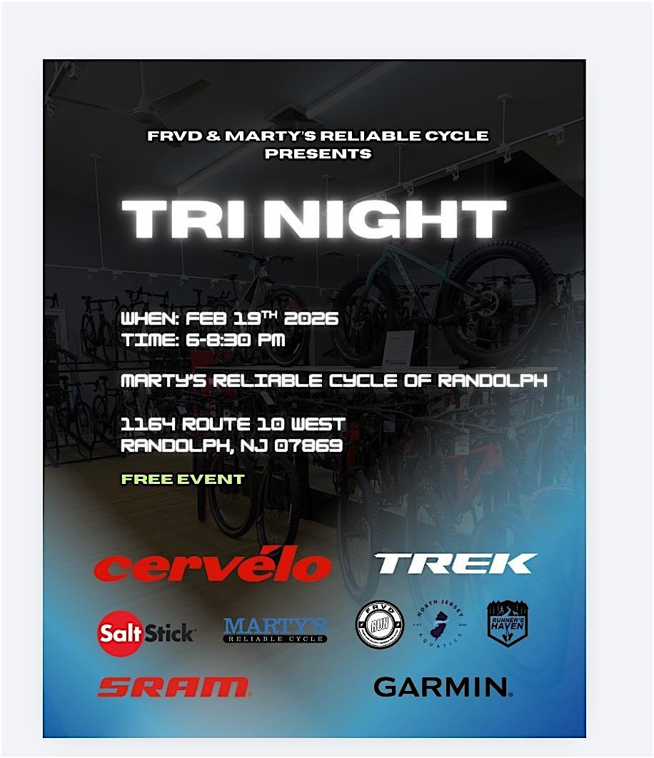 by admin12Feb Tri Night Presented by Marty’s Reliable Cycle and FRVD at Marty’s Reliable Cycle of Randolph – Randolph, NJ Tri Night Presented by Marty’s Reliable Cycle and FRVD at Marty’s Reliable Cycle of Randolph – Randolph, NJ 2 2 people viewed this event. Lets get swim, bike and run ready in 2026! Tickets-RSVP Link Date And Time Thursday, February 19th, 2026 11:00 PM (PST) Venue Marty's Reliable Cycle of Randolph Location 1164 New Jersey 10, Randolph, NJ 7869 Event Types Party or Social GatheringSports & Fitness Event Category New Jersey Share With Friends Facebook Twitter Linkedin Xing Pinterest Share This Post: