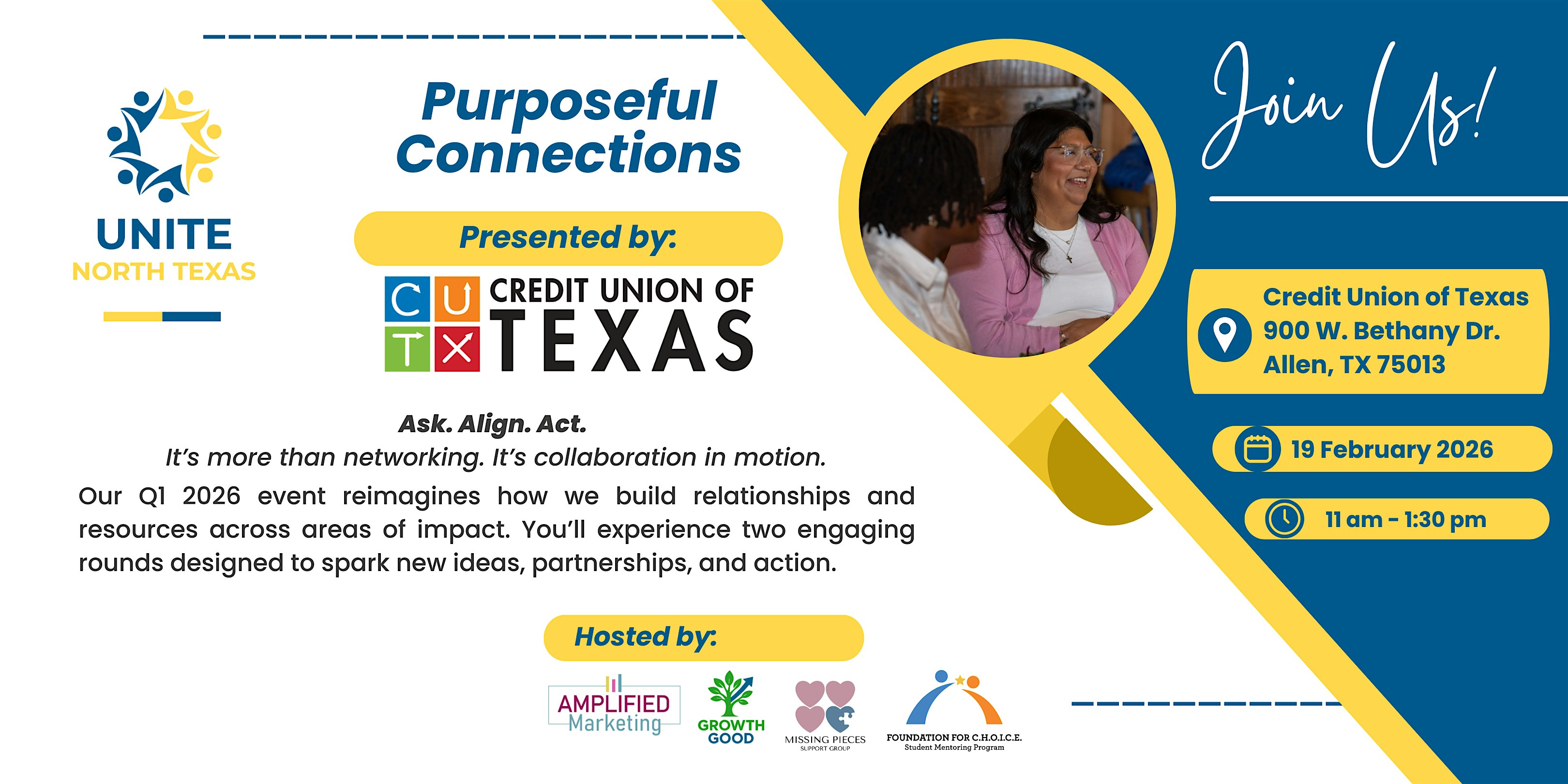by admin12Feb UNITE North Texas: Purposeful Connections at Credit Union of Texas – Allen, TX UNITE North Texas: Purposeful Connections at Credit Union of Texas – Allen, TX 3 3 people viewed this event. UNITE NTX returns with our Q1 2026 event to connect, collaborate, and create impact. PRESENTING SPONSOR: Credit Union of Texas Tickets-RSVP Link Date And Time Thursday, February 19th, 2026 05:00 PM (PST) Venue Credit Union of Texas Location 900 West Bethany Drive, Allen, TX 75013 Event Types Community & Culture Event Category DallasTexas Share With Friends Facebook Twitter Linkedin Xing Pinterest Share This Post: