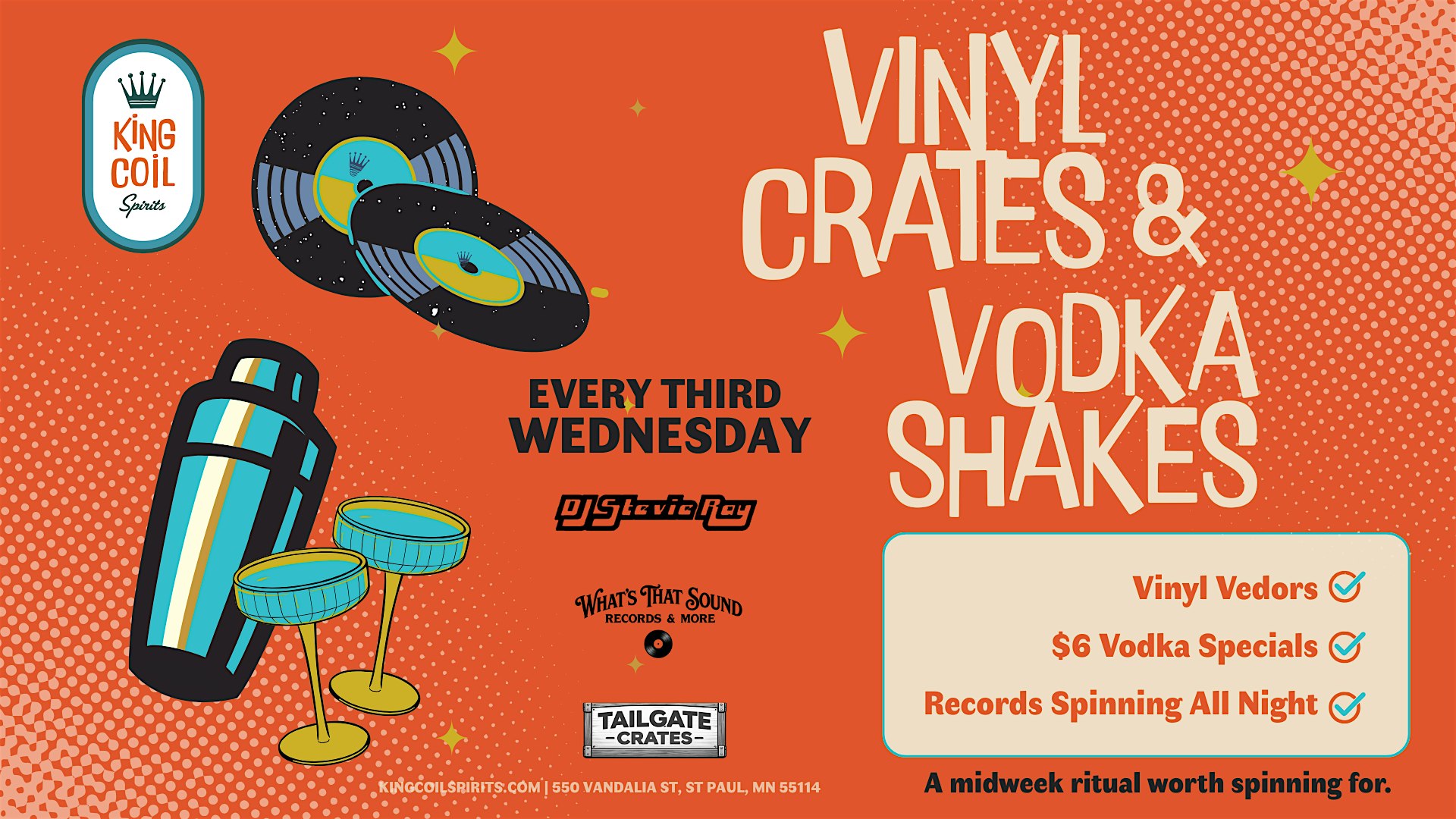 by admin12Feb Vinyl Crates & Vodka Shakes at King Coil Spirits – Saint Paul, MN Vinyl Crates & Vodka Shakes at King Coil Spirits – Saint Paul, MN 3 3 people viewed this event. Browse through several local vinyl vendors while sipping KC cocktails and listening to music the old school way! Tickets-RSVP Link Date And Time Thursday, February 19th, 2026 12:00 AM (PST) Venue King Coil Spirits Location 550 Vandalia Street, Saint Paul, MN 55114 Event Types Food & DrinkParty or Social Gathering Event Category MinneapolisMinnesota Share With Friends Facebook Twitter Linkedin Xing Pinterest Share This Post: