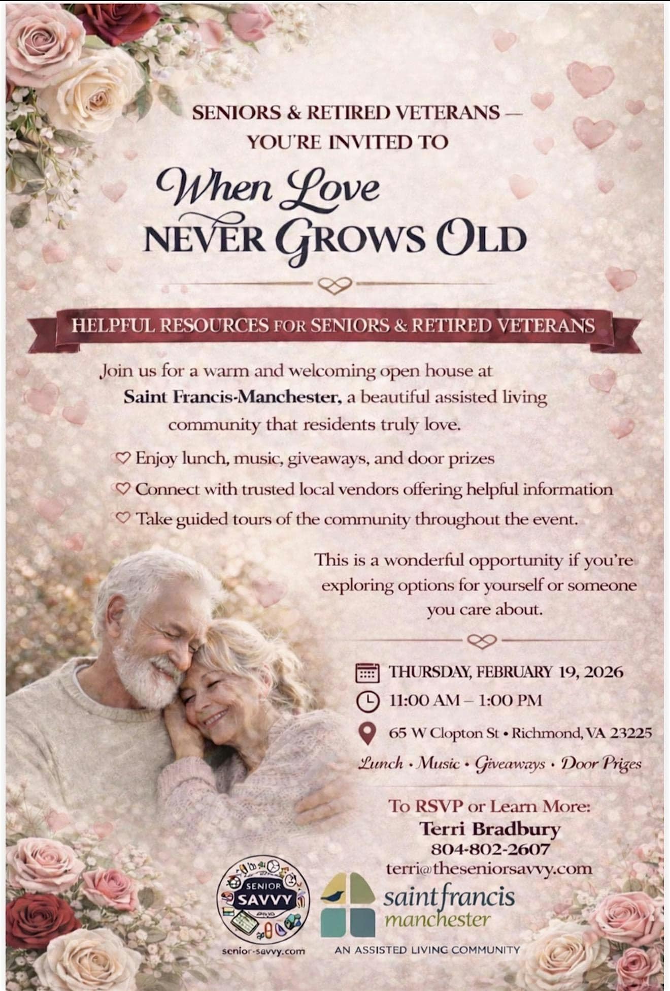 by admin14Feb When Love Never Grows Old at Saint Francis Manchester – Richmond, VA When Love Never Grows Old at Saint Francis Manchester – Richmond, VA 3 3 people viewed this event. Seniors & retired veterans are invited to a fun event! Free catered lunch, live music, great resources, giveaways & door prizes, plus tours. Tickets-RSVP Link Date And Time Thursday, February 19th, 2026 04:00 PM (PST) Venue Saint Francis Manchester Location 65 West Clopton Street, Richmond, VA 23225 Event Types Concert or Performance Event Category Virginia Share With Friends Facebook Twitter Linkedin Xing Pinterest Share This Post: