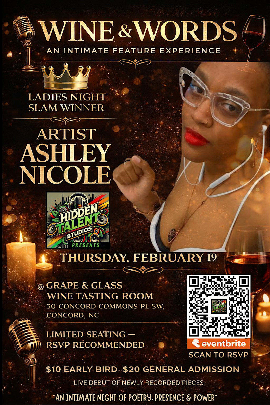 by admin12Feb WINE and WORDS | A Queendom Experience feat. ArtistAshleyNicole at Grape & Glass Wine Tasting Room – Concord, NC WINE and WORDS | A Queendom Experience feat. ArtistAshleyNicole at Grape & Glass Wine Tasting Room – Concord, NC 1 1 people viewed this event. Wine & Words | Spoken Word | Live Poetry | 1st Thursday — sip wine, hear powerful stories, and vibe with hidden talent. Tickets-RSVP Link Date And Time Thursday, February 19th, 2026 10:00 PM (PST) Venue Grape & Glass Wine Tasting Room Location 30 Concord Commons Place Southwest, Concord, NC 28027 Event Types Concert or PerformancePerforming & Visual Arts Event Category North Carolina Share With Friends Facebook Twitter Linkedin Xing Pinterest Share This Post: