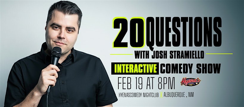 by admin12Feb 20 Questions w/ Josh Stramiello at Hyena’s Comedy Nightclub – Albuquerque, NM 20 Questions w/ Josh Stramiello at Hyena’s Comedy Nightclub – Albuquerque, NM 5 5 people viewed this event. If you love playing Would You Rather? Or Cards Against Humanity You are going to die laughing for Josh’s 20 Questions. Tickets-RSVP Link Date And Time Friday, February 20th, 2026 03:00 AM (PST) Venue Hyena's Comedy Nightclub Location 2100 Louisiana Boulevard Northeast, Albuquerque, NM 87110 Event Types ComedyConcert or PerformancePerforming & Visual Arts Event Category AlbuquerqueNew Mexico Share With Friends Facebook Twitter Linkedin Xing Pinterest Share This Post: