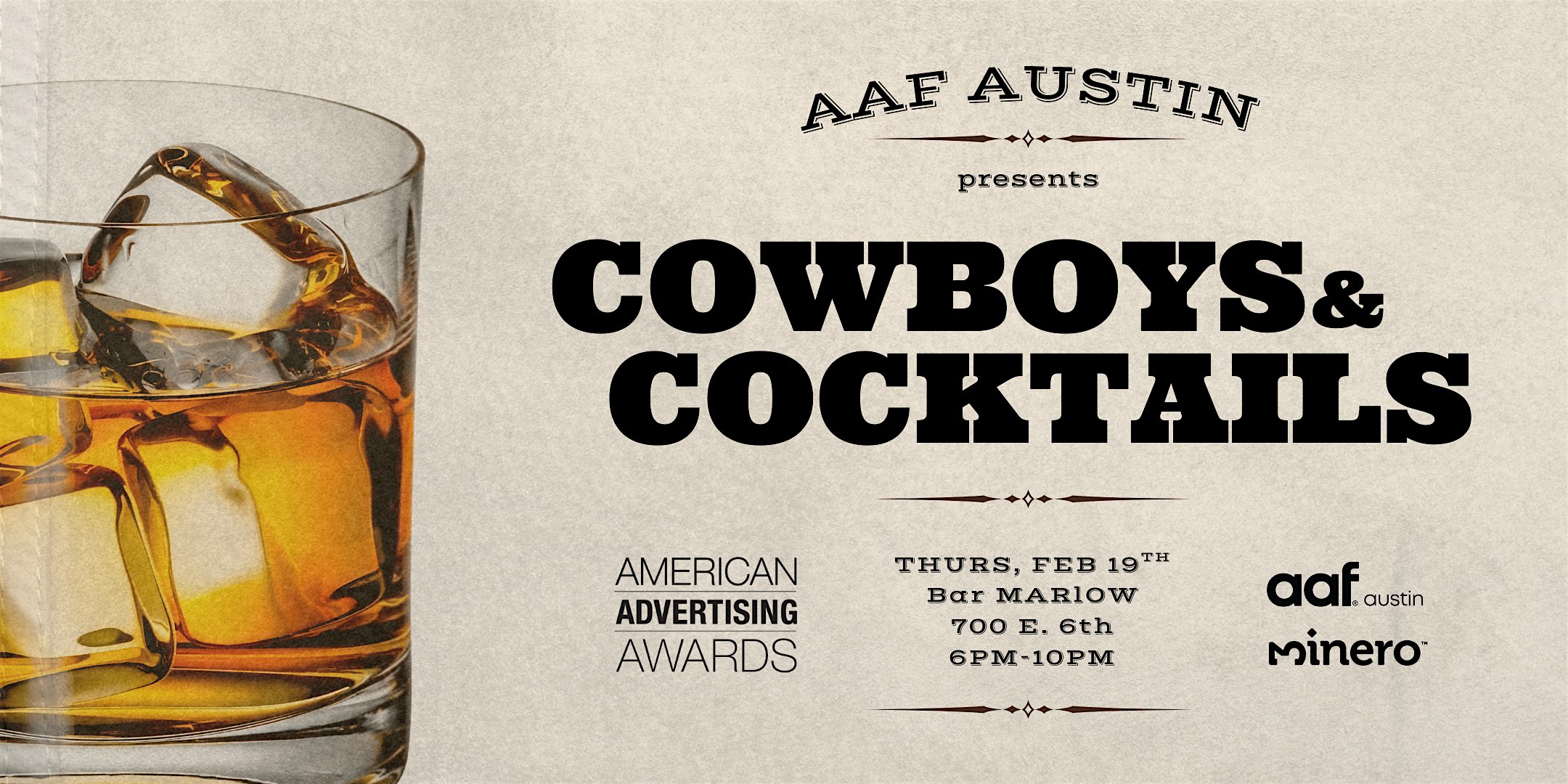 by admin12Feb 2026 AAF Austin’s American Advertising Awards: Cowboys & Cocktails at Marlow – Austin, TX 2026 AAF Austin’s American Advertising Awards: Cowboys & Cocktails at Marlow – Austin, TX 5 5 people viewed this event. Saddle up for a night celebrating the wild spirit of innovation, bold ideas, and Texas-sized creativity in the world of advertising! Tickets-RSVP Link Date And Time Friday, February 20th, 2026 12:00 AM (PST) Venue Marlow Location 700 East 6th Street, Austin, TX 78701 Event Types Film, Media & EntertainmentOther Event Category AustinTexas Share With Friends Facebook Twitter Linkedin Xing Pinterest Share This Post: