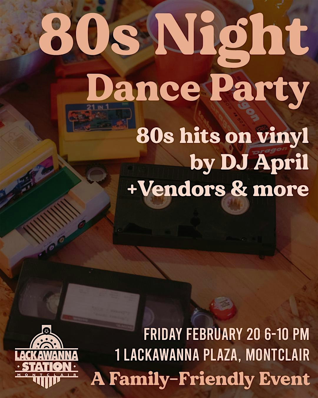 by admin12Feb 80s Night Dance Party at Lackawanna Station – Montclair, NJ 80s Night Dance Party at Lackawanna Station – Montclair, NJ 3 3 people viewed this event. A family friendly dance party with music you love! Tickets-RSVP Link Date And Time Friday, February 20th, 2026 11:00 PM (PST) Venue Lackawanna Station Location 1 Lackawanna Plaza, Montclair, NJ 7042 Event Types MusicParty or Social Gathering Event Category New Jersey Share With Friends Facebook Twitter Linkedin Xing Pinterest Share This Post: