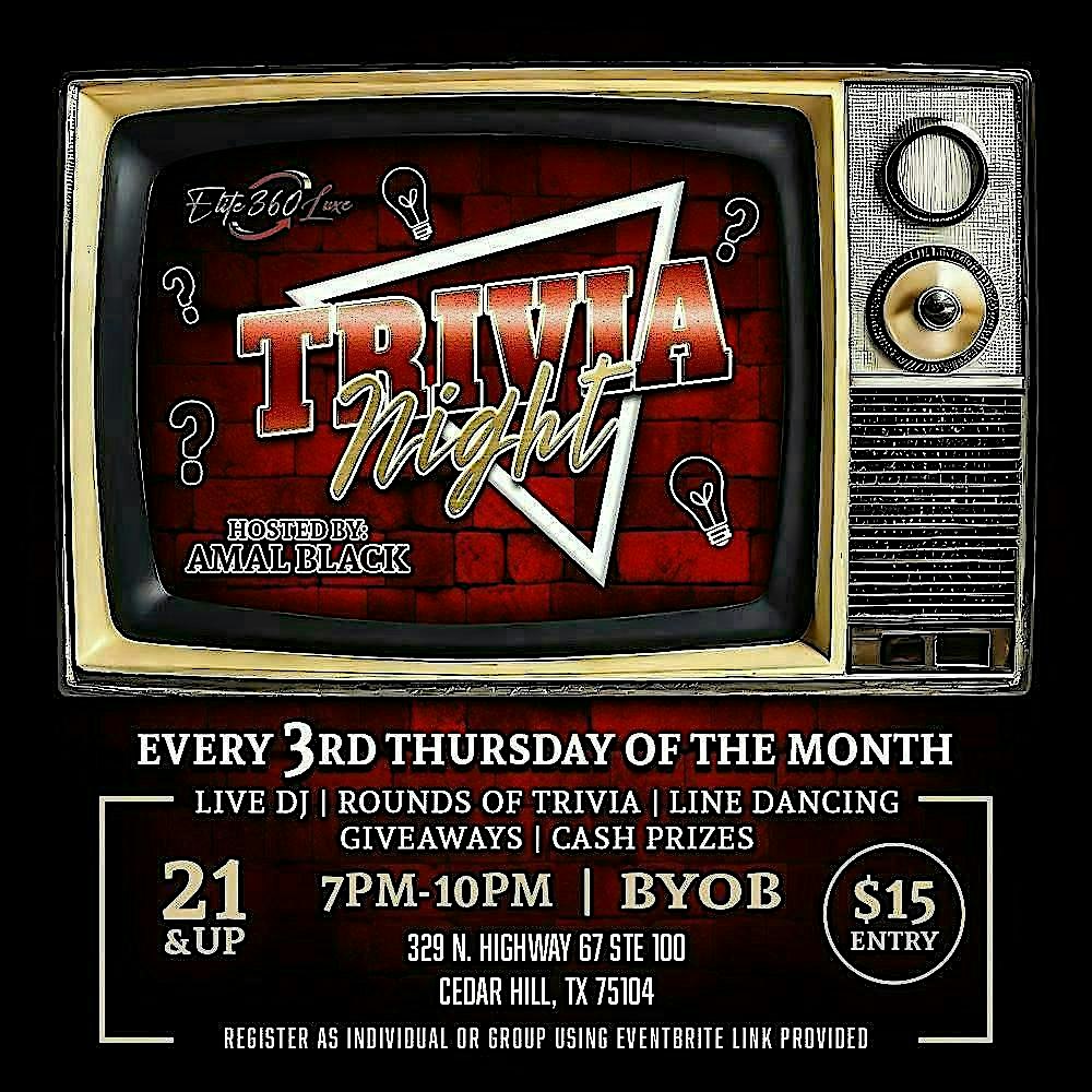 by admin12Feb BLACK HISTORY TRIVIA NIGHT at Elite 360 Luxe- TX – Cedar Hill, TX BLACK HISTORY TRIVIA NIGHT at Elite 360 Luxe- TX – Cedar Hill, TX 8 8 people viewed this event. Join us for a fun night of trivia! Enjoy good company, music, and drinks while your knowledge of Black History is tested! Tickets-RSVP Link Date And Time Friday, February 20th, 2026 01:00 AM (PST) Venue Elite 360 Luxe- TX Location 329 North Highway 67, Cedar Hill, TX 75104 Event Types Community & CultureOther Event Category Texas Share With Friends Facebook Twitter Linkedin Xing Pinterest Share This Post: