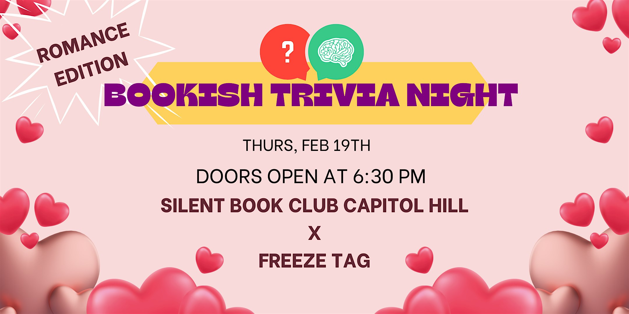 by admin12Feb Bookish Romance Trivia Night!! at a/stir – Seattle, WA Bookish Romance Trivia Night!! at a/stir – Seattle, WA 3 3 people viewed this event. Test your knowledge with some bookish trivia, romance edition. Tickets-RSVP Link Date And Time Friday, February 20th, 2026 02:00 AM (PST) Venue a/stir Location 818 East Pike Street, Seattle, WA 98122 Event Category SeattleWashington Share With Friends Facebook Twitter Linkedin Xing Pinterest Share This Post: