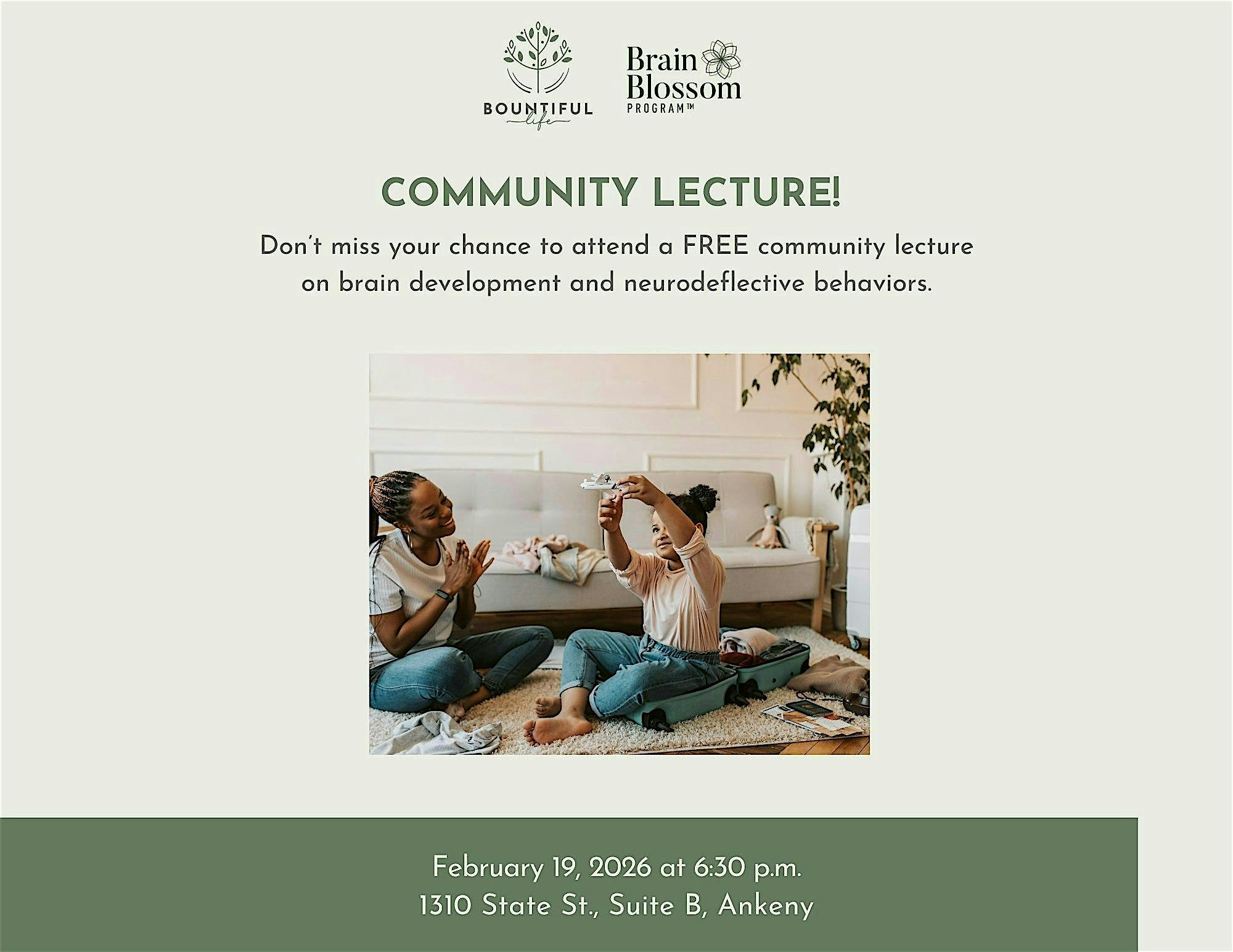 by admin12Feb Brain Development – Free Community Lecture at Bountiful Life – Ankeny, IA Brain Development – Free Community Lecture at Bountiful Life – Ankeny, IA 5 5 people viewed this event. When behavior doesn’t make sense, the brain holds the clues. Join us for clarity, hope, and next steps. Tickets-RSVP Link Date And Time Friday, February 20th, 2026 12:00 AM (PST) Venue Bountiful Life Location 1310 Southwest State Street, Ankeny, IA 50023 Event Category Des MoinesIowa Share With Friends Facebook Twitter Linkedin Xing Pinterest Share This Post:
