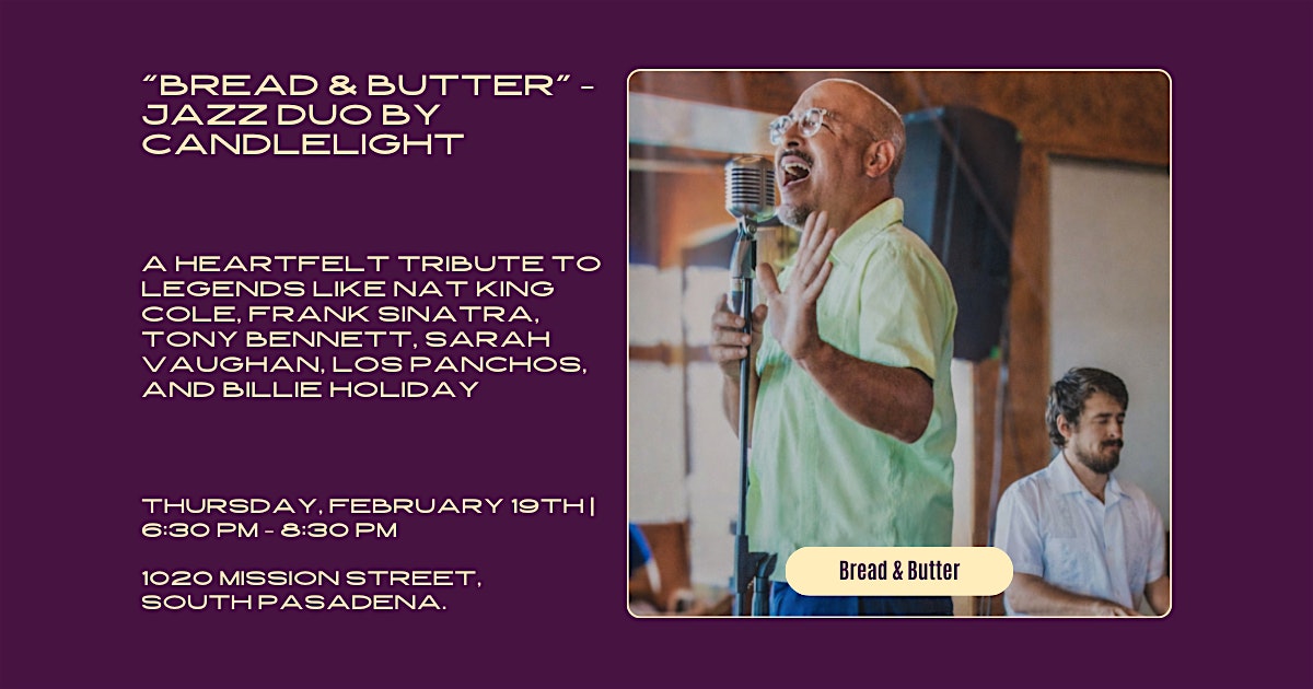 by admin13Feb “Bread & Butter” – Jazz Duo by Candlelight at 1020 Mission St – South Pasadena, CA “Bread & Butter” – Jazz Duo by Candlelight at 1020 Mission St – South Pasadena, CA 1 1 people viewed this event. A heartfelt tribute to legends like Nat King Cole, Frank Sinatra, Tony Bennett, Sarah Vaughan, Los Panchos, and Billie Holiday! Tickets-RSVP Link Date And Time Friday, February 20th, 2026 02:00 AM (PST) Venue 1020 Mission St Location 1020 Mission Street, South Pasadena, CA 91030 Event Types Concert or PerformanceMusic Event Category CaliforniaLos Angeles Share With Friends Facebook Twitter Linkedin Xing Pinterest Share This Post: