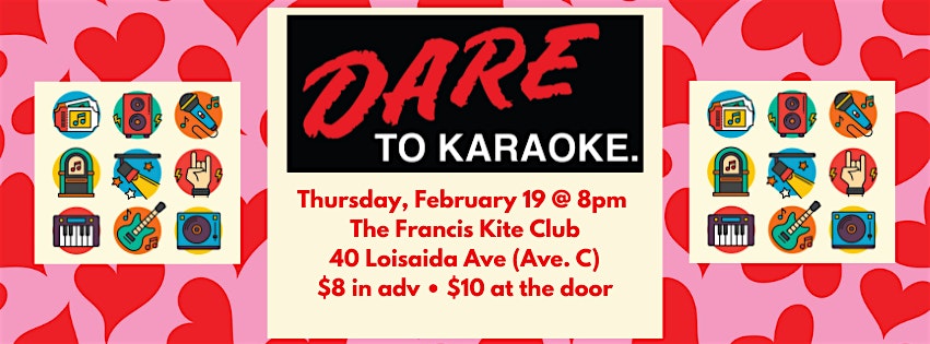 by admin12Feb Dare to Karaoke at The Francis Kite Club at Francis Kite Club – New York, NY Dare to Karaoke at The Francis Kite Club at Francis Kite Club – New York, NY 3 3 people viewed this event. Join us at the only karaoke night in NYC where we DARE you to sing! Tickets-RSVP Link Date And Time Friday, February 20th, 2026 01:00 AM (PST) Venue Francis Kite Club Location 40 Loisaida Avenue, New York, NY 10009 Event Types MusicParty or Social Gathering Event Category New YorkNew York City Share With Friends Facebook Twitter Linkedin Xing Pinterest Share This Post: