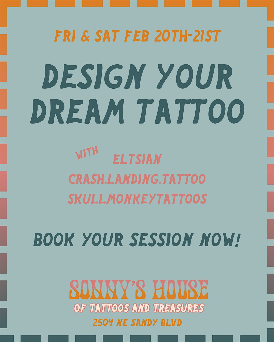 by admin12Feb Design Your Dream Tattoo at Sonny’s House of Tattoos and Treasures – Portland, OR Design Your Dream Tattoo at Sonny’s House of Tattoos and Treasures – Portland, OR 5 5 people viewed this event. Do you have a tattoo idea living rent free in your head? Tickets-RSVP Link Date And Time Friday, February 20th, 2026 08:00 PM (PST) Venue Sonny's House of Tattoos and Treasures Location 2504 Northeast Sandy Boulevard, Portland, OR 97232 Event Types Party or Social GatheringPerforming & Visual Arts Event Category OregonPortland Share With Friends Facebook Twitter Linkedin Xing Pinterest Share This Post: