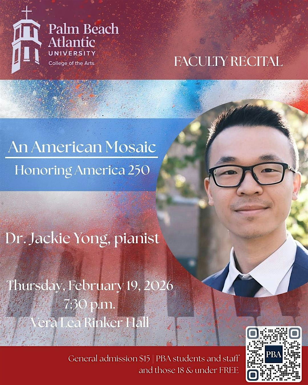 by admin12Feb Faculty Recital: Jackie Yong, pianist at Vera Lea Rinker Hall – West Palm Beach, FL Faculty Recital: Jackie Yong, pianist at Vera Lea Rinker Hall – West Palm Beach, FL 3 3 people viewed this event. Join us for a recital honoring America 250. Tickets-RSVP Link Date And Time Friday, February 20th, 2026 12:00 AM (PST) Venue Vera Lea Rinker Hall Location 326 Acacia Road, West Palm Beach, FL 33401 Event Types Concert or PerformanceMusicOther Event Category Florida Share With Friends Facebook Twitter Linkedin Xing Pinterest Share This Post: