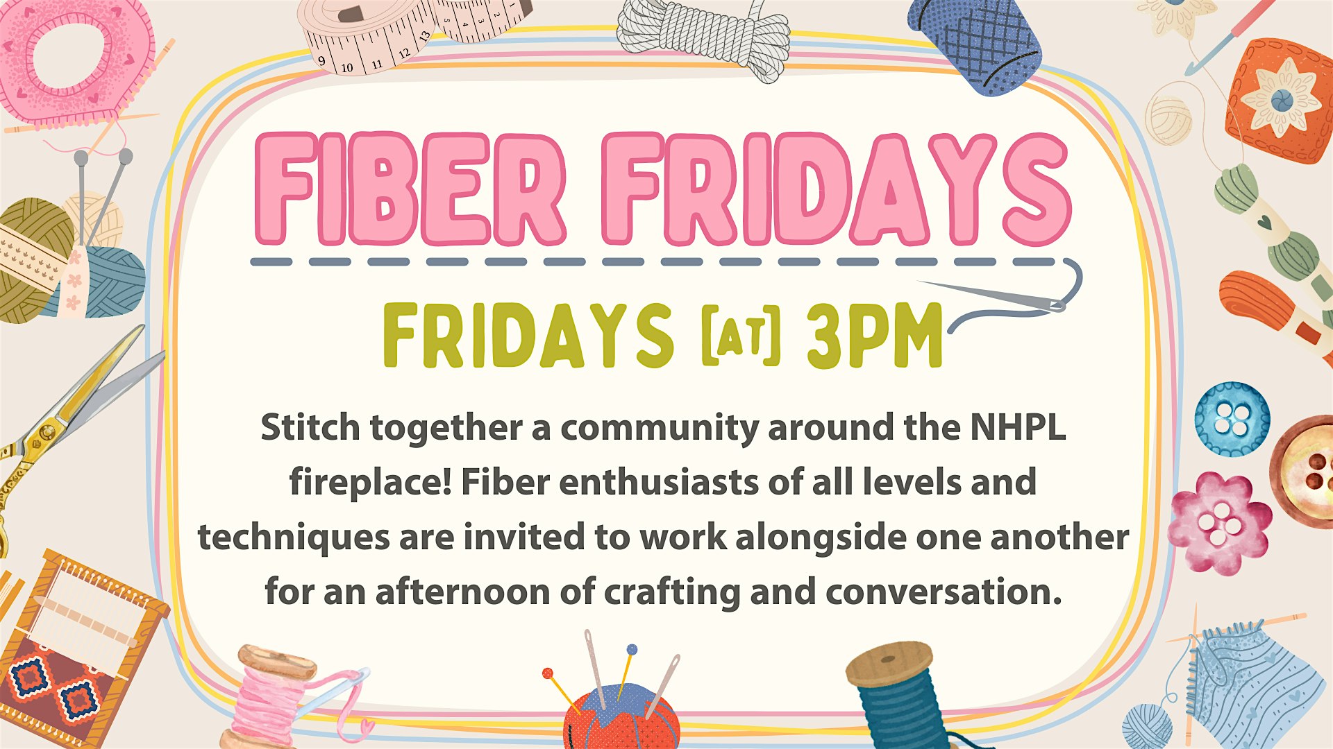 by admin13Feb Fiber Fridays at North Hampton Public Library – North Hampton, NH Fiber Fridays at North Hampton Public Library – North Hampton, NH 3 3 people viewed this event. Fiber enthusiasts of all levels and techniques are invited to work alongside one another for an afternoon of crafting and conversation. Tickets-RSVP Link Date And Time Friday, February 20th, 2026 08:00 PM (PST) Venue North Hampton Public Library Location 239 Atlantic Avenue, North Hampton, NH 3862 Event Types Other Event Category New Hampshire Share With Friends Facebook Twitter Linkedin Xing Pinterest Share This Post: