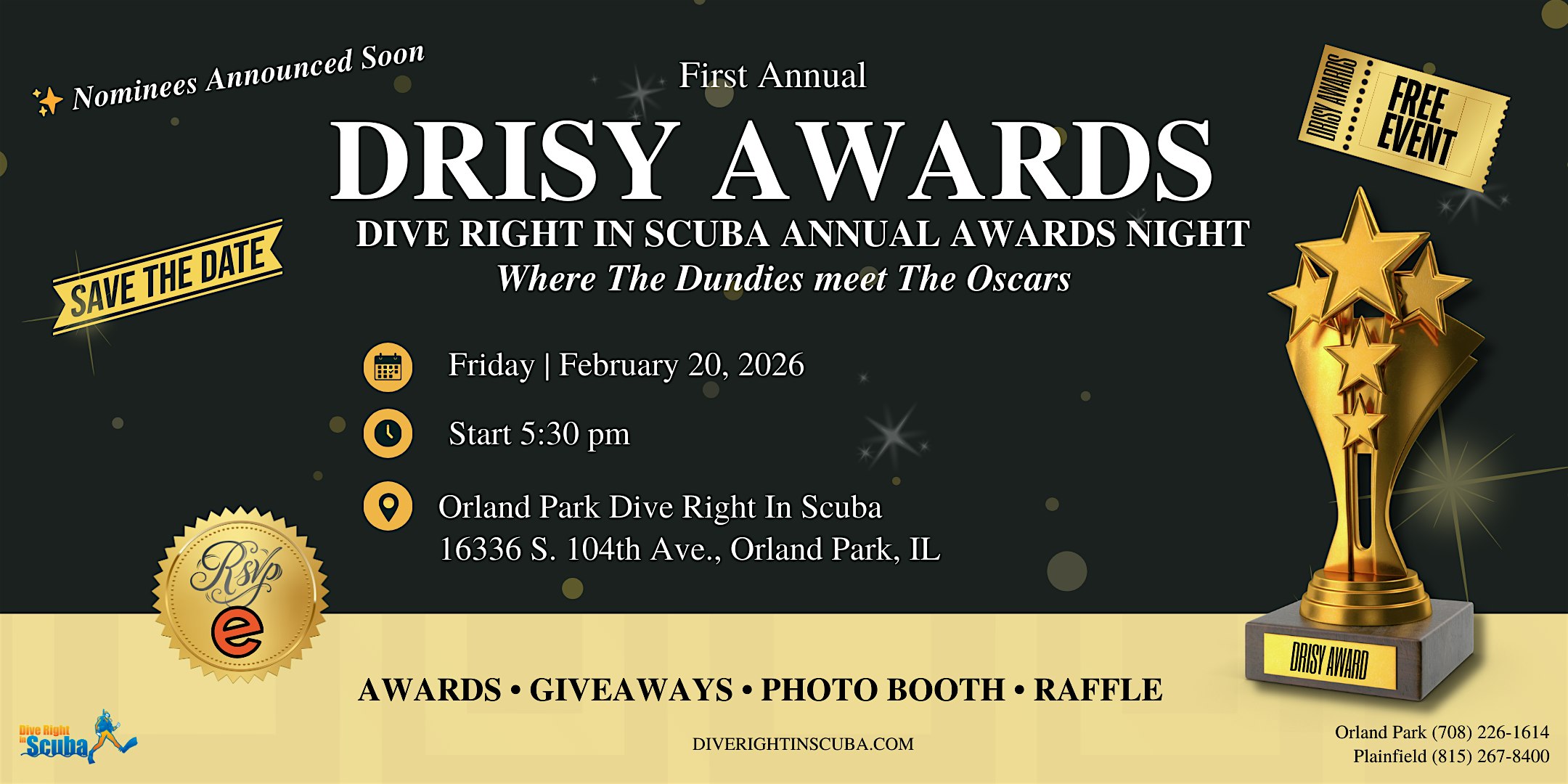 by admin13Feb First Annual DRISY Awards – Dive Right In Scuba at Dive Right In Scuba of Orland Park – Orland Park, IL First Annual DRISY Awards – Dive Right In Scuba at Dive Right In Scuba of Orland Park – Orland Park, IL 2 2 people viewed this event. Join us for a fun, Oscars-style awards night filled with recognition, giveaways, and community. Tickets-RSVP Link Date And Time Friday, February 20th, 2026 11:00 PM (PST) Venue Dive Right In Scuba of Orland Park Location 16336 104th Avenue, Orland Park, IL 60467 Event Types Party or Social Gathering Event Category ChicagoIllinois Share With Friends Facebook Twitter Linkedin Xing Pinterest Share This Post: