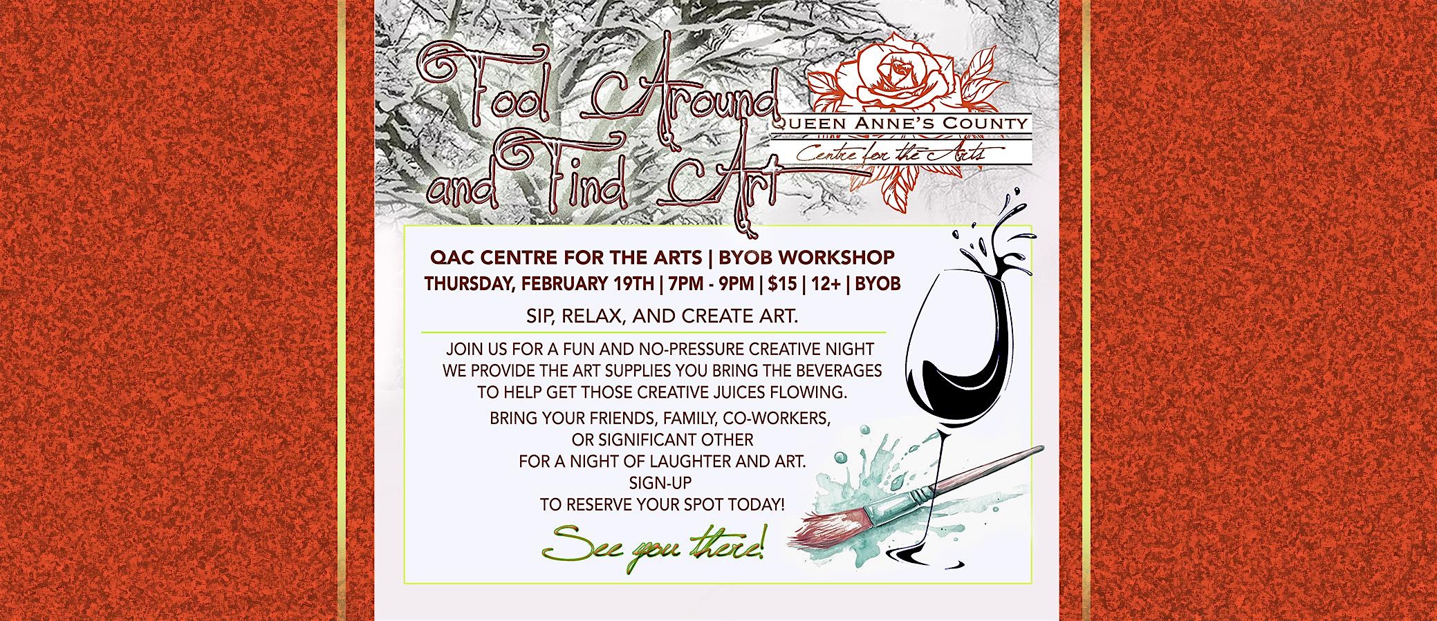 by admin12Feb Fool Around and Find Art at QACAC at Queen Annes County Art Council – Centreville, MD Fool Around and Find Art at QACAC at Queen Annes County Art Council – Centreville, MD 3 3 people viewed this event. A casual, fun night of creativity here at the Centre for the Arts! Tickets-RSVP Link Date And Time Friday, February 20th, 2026 12:00 AM (PST) Venue Queen Annes County Art Council Location 206 South Commerce Street, Centreville, MD 21617 Event Types Party or Social GatheringPerforming & Visual Arts Event Category Maryland Share With Friends Facebook Twitter Linkedin Xing Pinterest Share This Post: