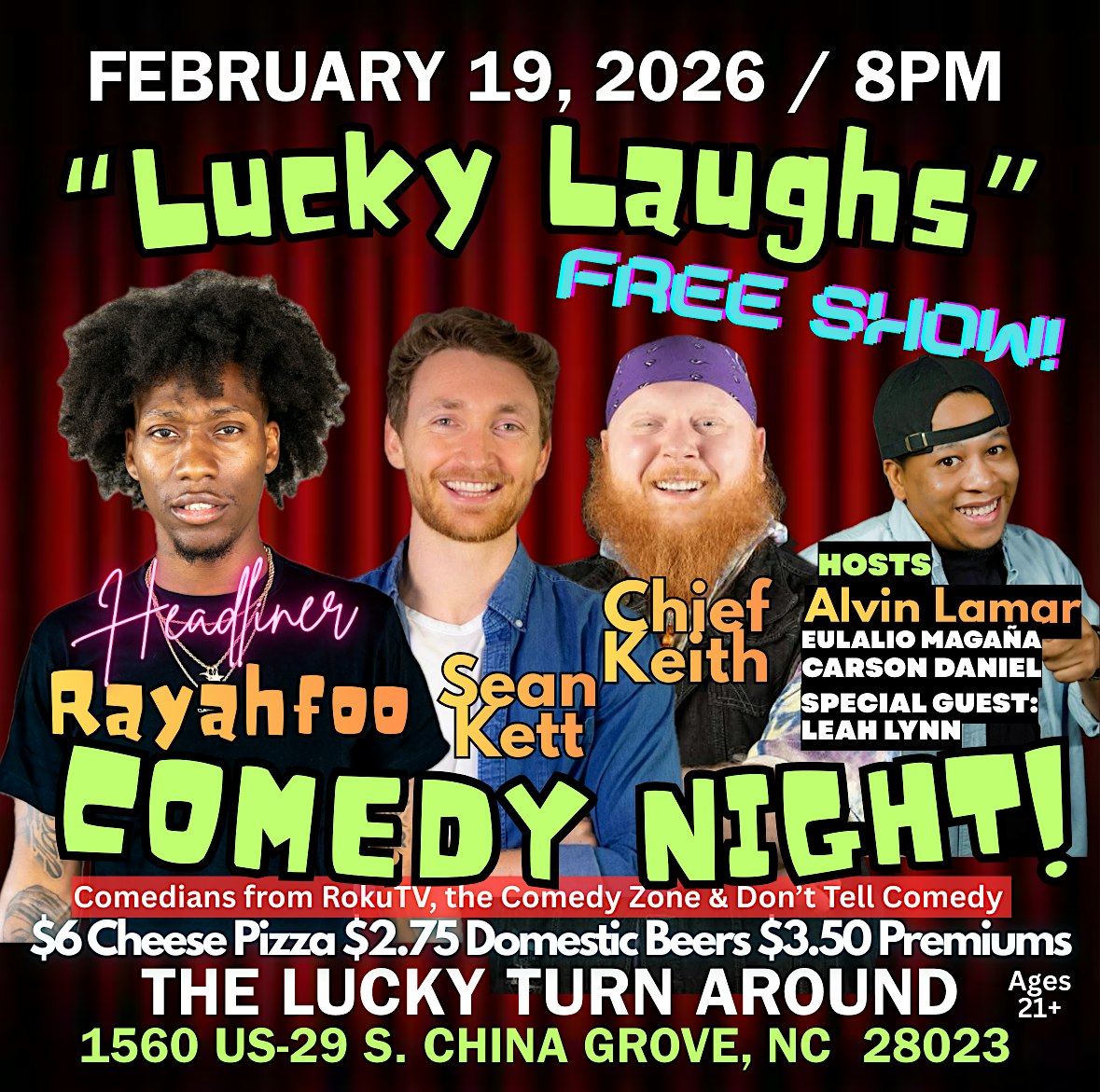 by admin12Feb FREE Comedy Show at The Lucky Turn Around at 1560 US-29 – China Grove, NC FREE Comedy Show at The Lucky Turn Around at 1560 US-29 – China Grove, NC 5 5 people viewed this event. Free Comedy Show at The Lucky Turn Around in China Grove, NC! Tickets-RSVP Link Date And Time Friday, February 20th, 2026 01:00 AM (PST) Venue 1560 US-29 Location 1560 U.S. 29, China Grove, NC 28023 Event Types Concert or PerformancePerforming & Visual Arts Event Category North Carolina Share With Friends Facebook Twitter Linkedin Xing Pinterest Share This Post: