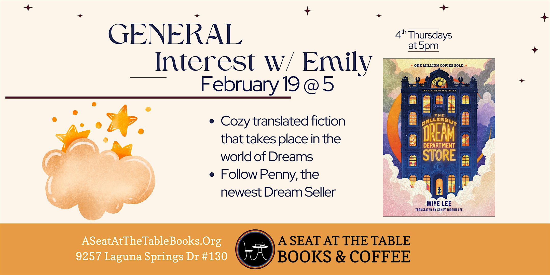 by admin12Feb General Interest Book Club w/ Emily: The Dallergut Dream Department Store at A Seat at the Table Books – Elk Grove, CA General Interest Book Club w/ Emily: The Dallergut Dream Department Store at A Seat at the Table Books – Elk Grove, CA 3 3 people viewed this event. Join Emily on February 26 at 5pm to discuss Miye Lee’s magical realism novel, The Dallergut Dream Department Store. Tickets-RSVP Link Date And Time Friday, February 20th, 2026 01:00 AM (PST) Venue A Seat at the Table Books Location 9257 Laguna Springs Drive, Elk Grove, CA 95758 Event Types Community & CultureOther Event Category CaliforniaSacramento Share With Friends Facebook Twitter Linkedin Xing Pinterest Share This Post:
