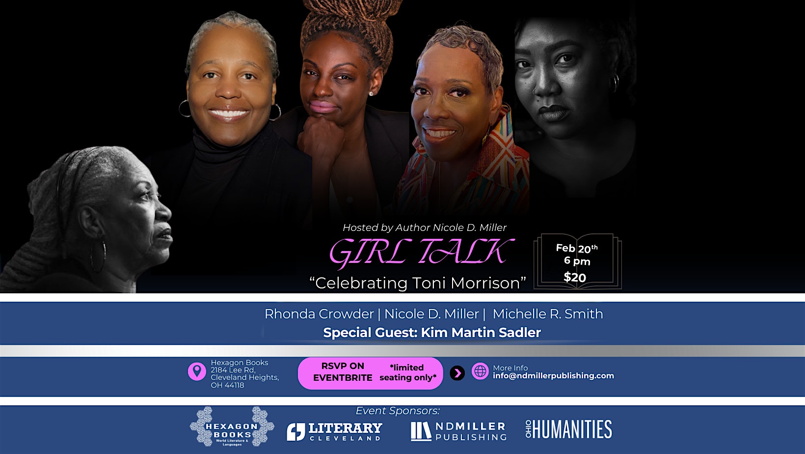 by admin12Feb Girl Talk: Celebrating Toni Morrison at Hexagon Books – Cleveland Heights, OH Girl Talk: Celebrating Toni Morrison at Hexagon Books – Cleveland Heights, OH 5 5 people viewed this event. Four Black, award winning, best selling, female leaders in the literary space discuss the impacts of the legacy of Toni Morrison. Tickets-RSVP Link Date And Time Friday, February 20th, 2026 11:00 PM (PST) Venue Hexagon Books Location 2184 Lee Road, Cleveland Heights, OH 44118 Event Types Community & Culture Event Category ClevelandOhio Share With Friends Facebook Twitter Linkedin Xing Pinterest Share This Post: