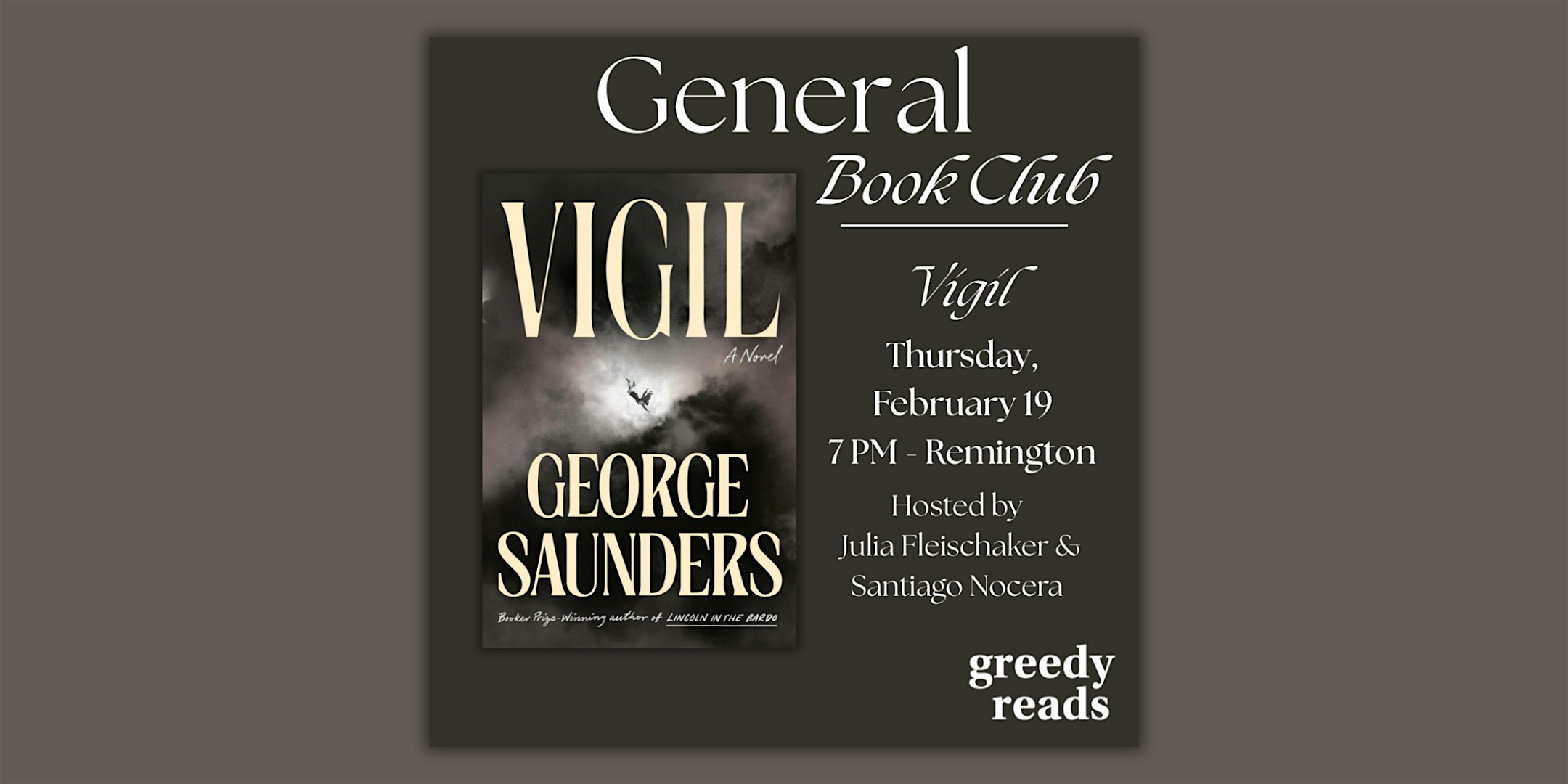by admin12Feb Greedy Reads Book Club February: “Vigil” by George Saunders at Greedy Reads Remington – Baltimore, MD Greedy Reads Book Club February: “Vigil” by George Saunders at Greedy Reads Remington – Baltimore, MD 1 1 people viewed this event. Join us in February to read and discuss “Vigil” by George Saunders! Tickets-RSVP Link Date And Time Friday, February 20th, 2026 12:00 AM (PST) Venue Greedy Reads Remington Location 320 West 29th Street, Baltimore, MD 21211 Event Category BaltimoreMaryland Share With Friends Facebook Twitter Linkedin Xing Pinterest Share This Post:
