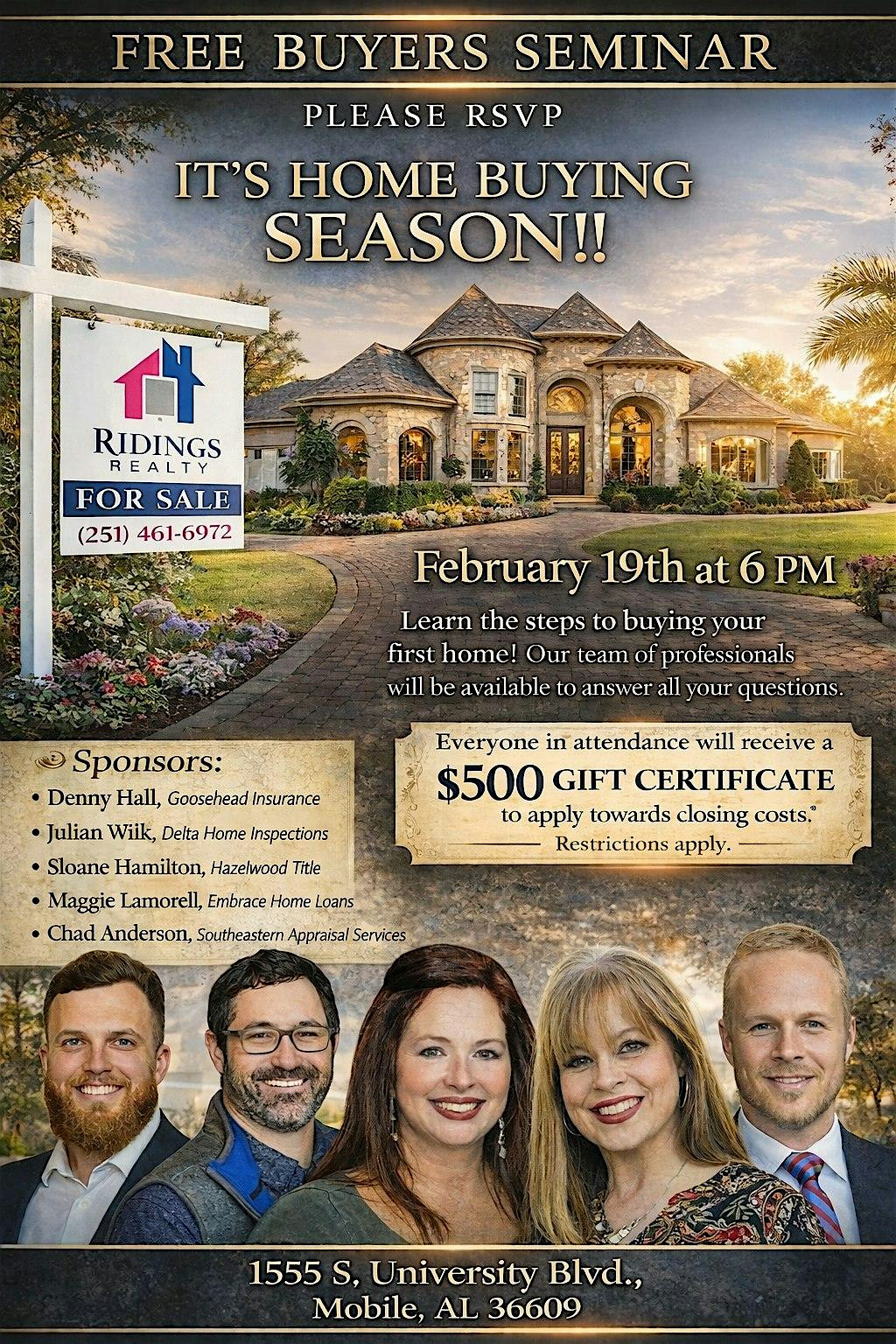 by admin12Feb Home Buying Made Easy with Ridings Realty! at 1555 S University Blvd – Mobile, AL Home Buying Made Easy with Ridings Realty! at 1555 S University Blvd – Mobile, AL 4 4 people viewed this event. Are you ready to take the next step toward buying your dream home, but feeling unsure about the process? Join us for Q&A, food & prizes! Tickets-RSVP Link Date And Time Friday, February 20th, 2026 12:00 AM (PST) Venue 1555 S University Blvd Location 1555 South University Boulevard, Mobile, AL 36609 Event Category AlabamaMobile Share With Friends Facebook Twitter Linkedin Xing Pinterest Share This Post: