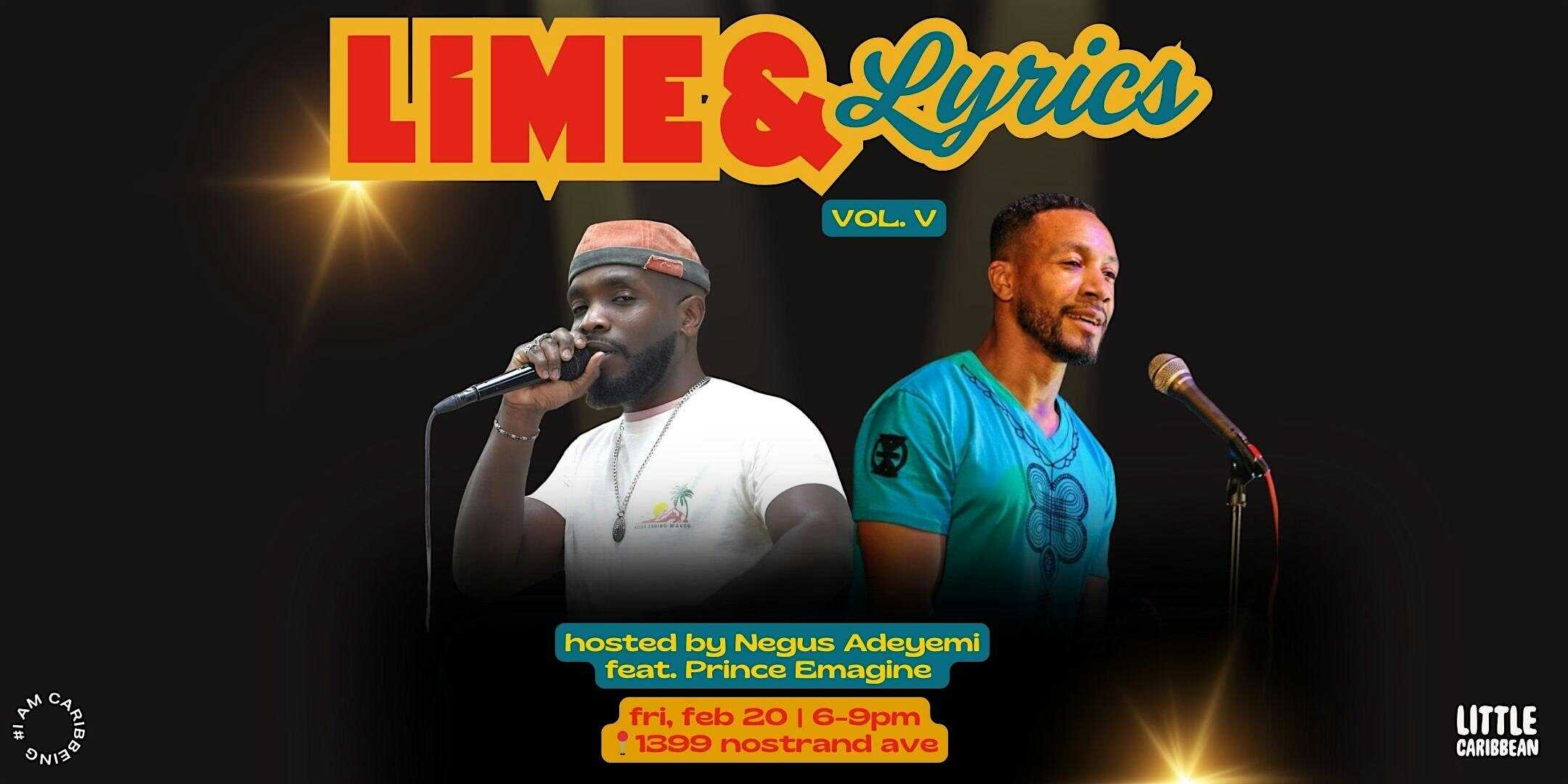 by admin14Feb Lime & Lyrics in Little Caribbean, Volume V feat. Prince Emagine at I AM CARIBBEING HQ – Brooklyn, NY Lime & Lyrics in Little Caribbean, Volume V feat. Prince Emagine at I AM CARIBBEING HQ – Brooklyn, NY 2 2 people viewed this event. Join us for Lime & Lyrics Vol V – an intimate night of Caribbean soul featuring Prince Emagine, the Falsetto King. Tickets-RSVP Link Date And Time Friday, February 20th, 2026 11:00 PM (PST) Venue I AM CARIBBEING HQ Location 1399 Nostrand Ave, Brooklyn, NY 11226 Event Types Community & CultureConcert or Performance Event Category New York Share With Friends Facebook Twitter Linkedin Xing Pinterest Share This Post:
