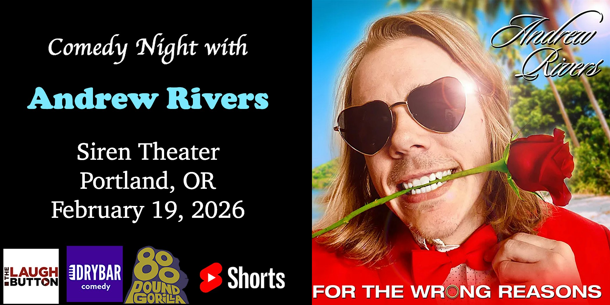 by admin12Feb Live Comedy with Andrew Rivers in Portland, OR at The Siren Theater – Portland, OR Live Comedy with Andrew Rivers in Portland, OR at The Siren Theater – Portland, OR 6 6 people viewed this event. A professional stand up comedy show featuring Andrew Rivers and friends in Portland, Oregon at Siren theater Tickets-RSVP Link Date And Time Friday, February 20th, 2026 04:00 AM (PST) Venue The Siren Theater Location 3913 North Mississippi Avenue, Portland, OR 97227 Event Types ComedyConcert or PerformancePerforming & Visual Arts Event Category OregonPortland Share With Friends Facebook Twitter Linkedin Xing Pinterest Share This Post: