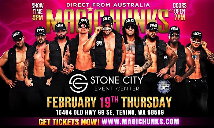 by admin12Feb MAGIC HUNKS® AUSTRALIA TAKEOVER TENINO, WA USA!!! at Stone City Event Center – Tenino, WA MAGIC HUNKS® AUSTRALIA TAKEOVER TENINO, WA USA!!! at Stone City Event Center – Tenino, WA 3 3 people viewed this event. Australia’s Ultimate Ladies Night Event Is Coming to Tenino! Limited Tickets On Sale NOW! Open to Ages 21+ Doors open at 7pm Tickets-RSVP Link Date And Time Friday, February 20th, 2026 04:00 AM (PST) Venue Stone City Event Center Location 16404 Old Highway 99 Southeast, Tenino, WA 98589 Event Types Concert or PerformancePerforming & Visual Arts Event Category Washington Share With Friends Facebook Twitter Linkedin Xing Pinterest Share This Post: