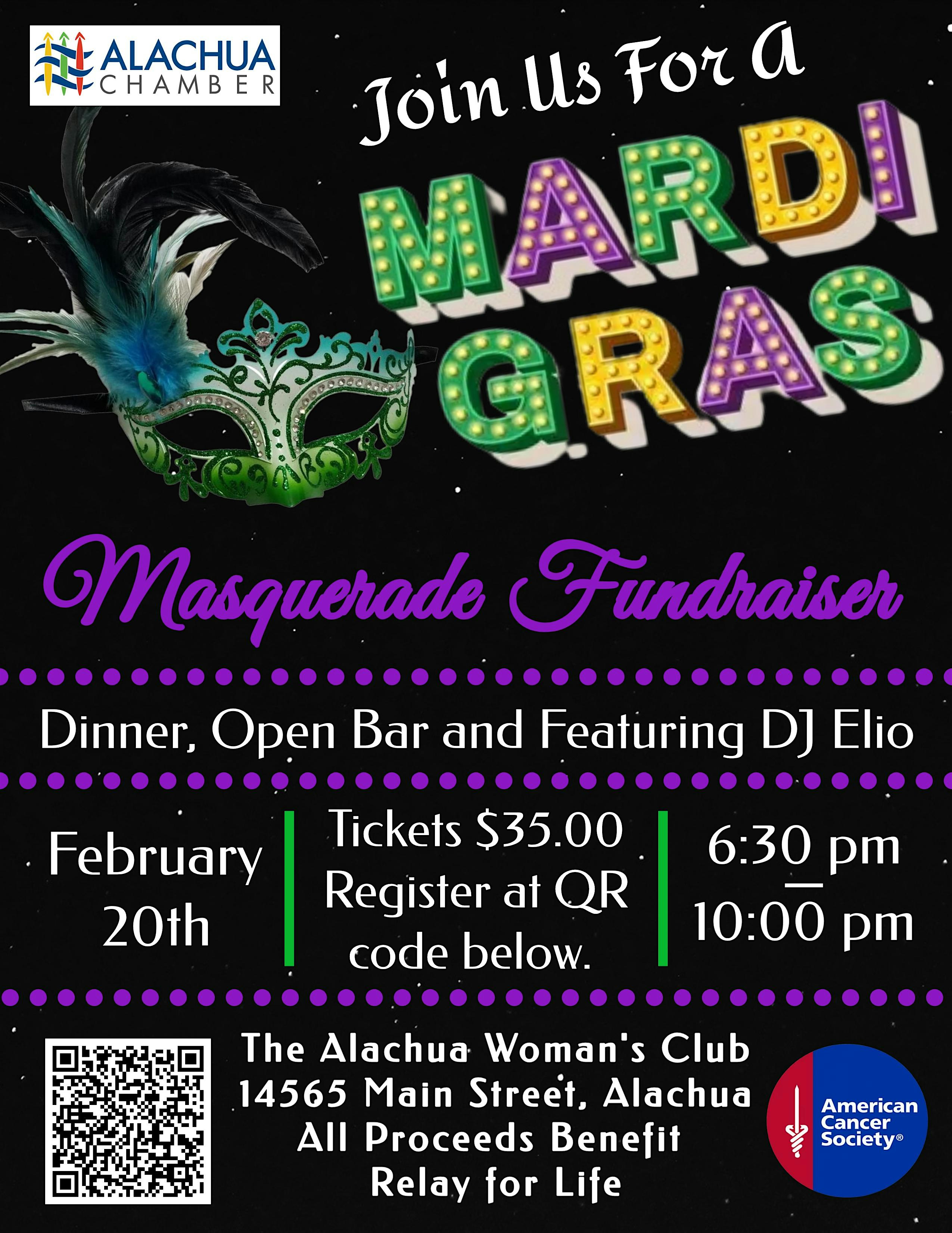 by admin12Feb Mardi Gras Masquerade Fundraiser at Alachua Woman’s Club – Alachua, FL Mardi Gras Masquerade Fundraiser at Alachua Woman’s Club – Alachua, FL 4 4 people viewed this event. Mask up for a Mardi Gras Masquerade—an unforgettable night of fun, food, and giving back in support of Relay for Life! Tickets-RSVP Link Date And Time Friday, February 20th, 2026 11:00 PM (PST) Venue Alachua Woman’s Club Location 14565 Main Street, Alachua, FL 32615 Event Types Charity & CausesParty or Social Gathering Event Category Florida Share With Friends Facebook Twitter Linkedin Xing Pinterest Share This Post: