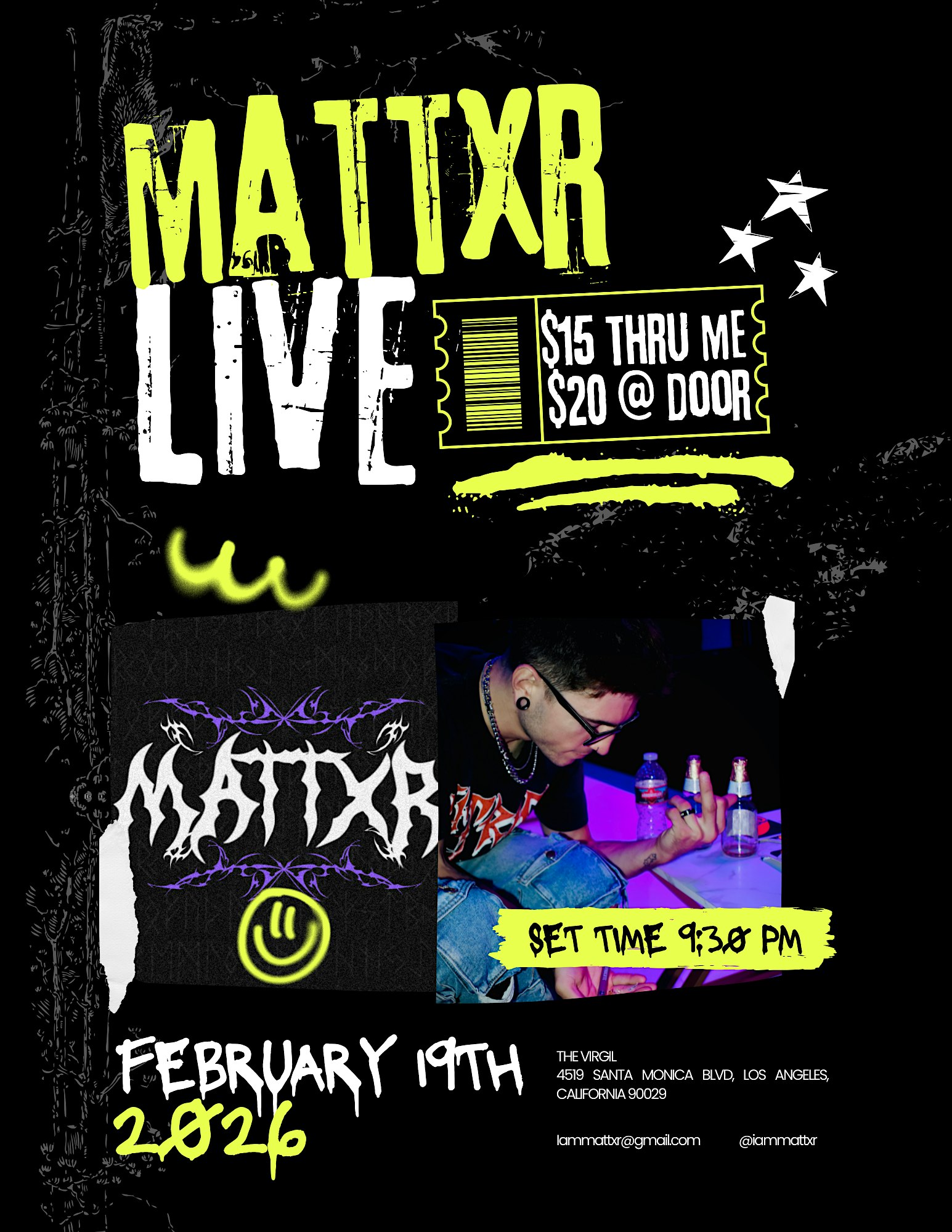 by admin13Feb Mattxr Live at The Virgil at The Virgil – Los Angeles, CA Mattxr Live at The Virgil at The Virgil – Los Angeles, CA 3 3 people viewed this event. Mattxr will be performing a 40 minute set starting at 9:30 Tickets-RSVP Link Date And Time Friday, February 20th, 2026 05:00 AM (PST) Venue The Virgil Location 4519 Santa Monica Boulevard, Los Angeles, CA 90029 Event Types Concert or PerformanceMusic Event Category CaliforniaLos Angeles Share With Friends Facebook Twitter Linkedin Xing Pinterest Share This Post: