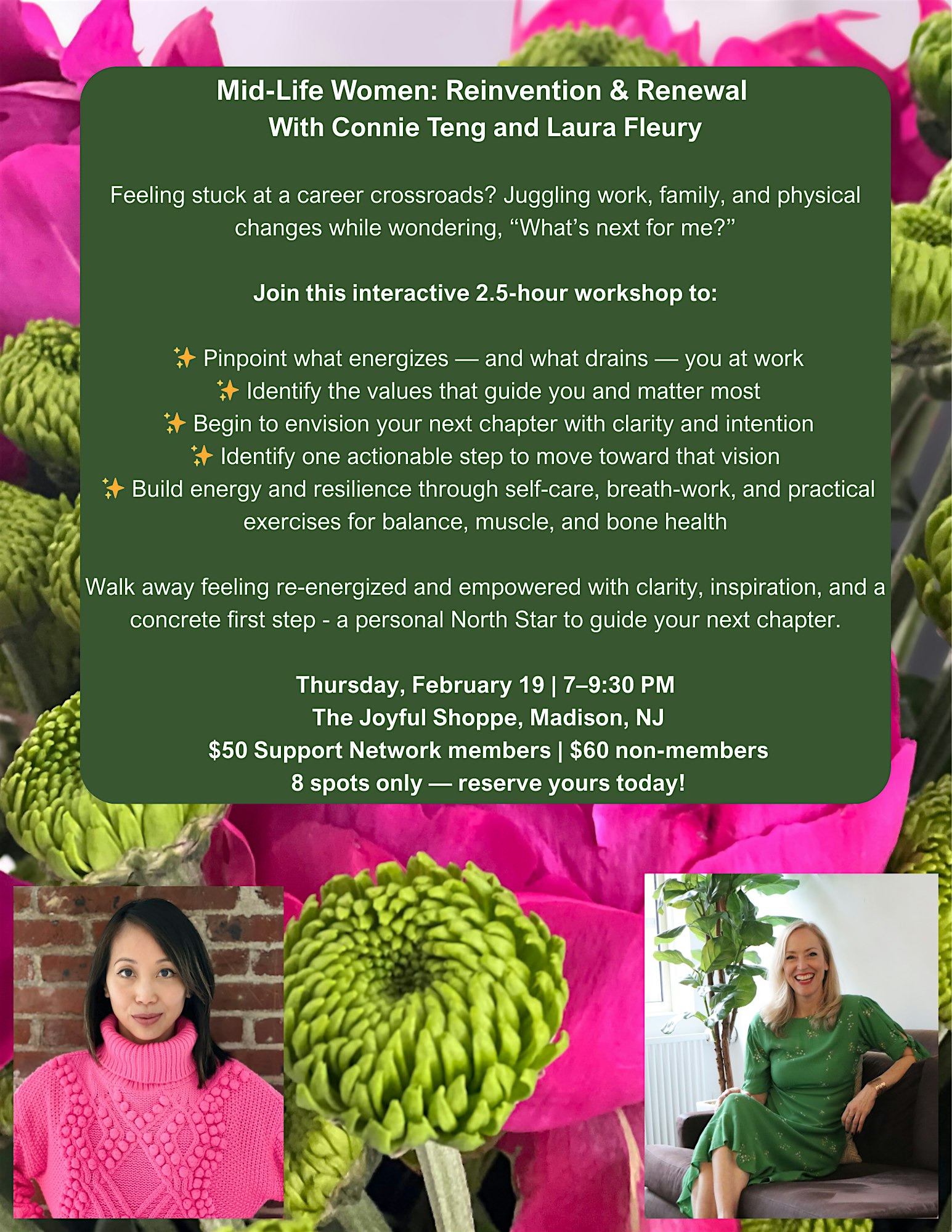 by admin12Feb Mid-life Women: Reinvention & Renewal with Connie Teng & Laura Fleury at The Joyful Shoppe – Madison, NJ Mid-life Women: Reinvention & Renewal with Connie Teng & Laura Fleury at The Joyful Shoppe – Madison, NJ 4 4 people viewed this event. Your Next Chapter Starts Here. Tickets-RSVP Link Date And Time Friday, February 20th, 2026 12:00 AM (PST) Venue The Joyful Shoppe Location 42 Lincoln Place, Madison, NJ 7940 Event Category New Jersey Share With Friends Facebook Twitter Linkedin Xing Pinterest Share This Post: