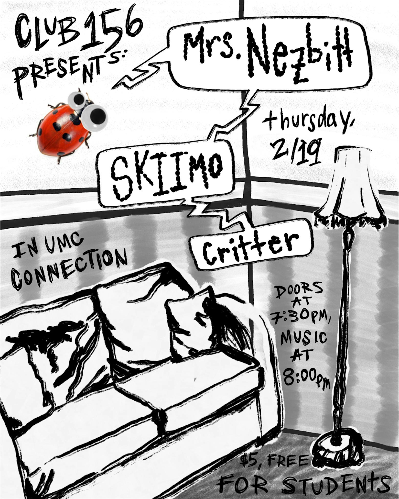 by admin12Feb Mrs. Nezbitt, SKIIMO, & Critter at Club 156 – Boulder, CO Mrs. Nezbitt, SKIIMO, & Critter at Club 156 – Boulder, CO 3 3 people viewed this event. Mrs. Nezbitt will be performing at Club 156! Additional act to be announced. Located in the Connection in the University Memorial Center. Tickets-RSVP Link Date And Time Friday, February 20th, 2026 02:00 AM (PST) Venue Club 156 Location 1669 Euclid Ave, Boulder, CO 80302 Event Types Concert or PerformanceMusicOther Event Category BoulderColorado Share With Friends Facebook Twitter Linkedin Xing Pinterest Share This Post: