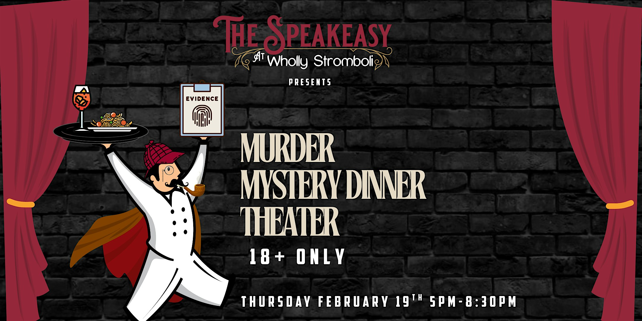 by admin12Feb Murder Mystery Dinner Theater – Bullets in the Bathtub at Wholly Stromboli – Fort Lupton, CO Murder Mystery Dinner Theater – Bullets in the Bathtub at Wholly Stromboli – Fort Lupton, CO 3 3 people viewed this event. A roaring 1920’s murder mystery complete with gangsters, flappers, and bootleggers. Tickets-RSVP Link Date And Time Friday, February 20th, 2026 12:00 AM (PST) Venue Wholly Stromboli Location 410 Denver Avenue, Fort Lupton, CO 80621 Event Types Concert or PerformanceOtherPerforming & Visual Arts Event Category Colorado Share With Friends Facebook Twitter Linkedin Xing Pinterest Share This Post: