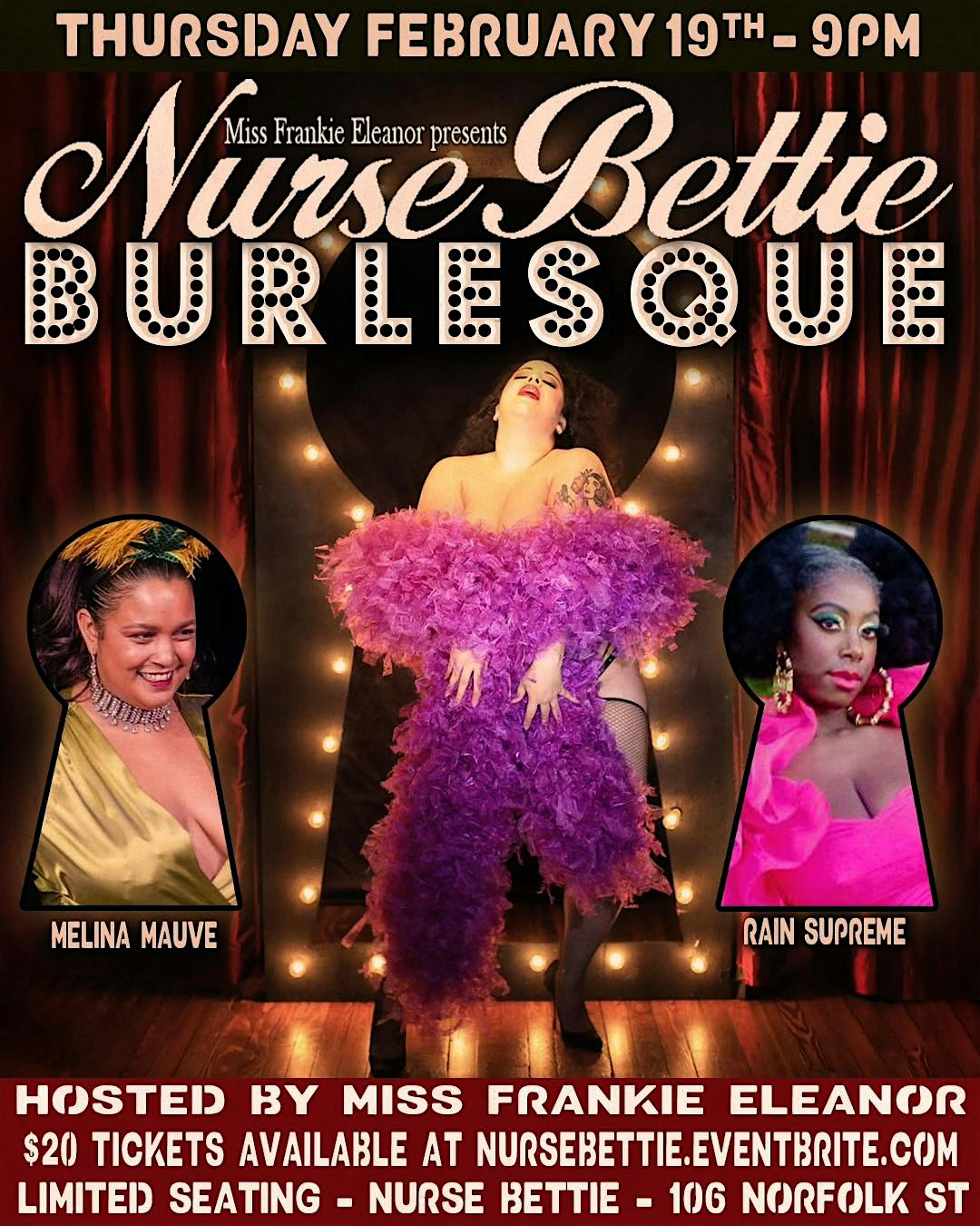 by admin12Feb Nurse Bettie Burlesque Show at Nurse Bettie – New York, NY Nurse Bettie Burlesque Show at Nurse Bettie – New York, NY 4 4 people viewed this event. Miss Frankie Eleanor presents Nurse Bettie Burlesque! February 19th, 9PM. Featuring Melina Mauve & Rain Supreme! Tickets-RSVP Link Date And Time Friday, February 20th, 2026 02:00 AM (PST) Venue Nurse Bettie Location 106 Norfolk Street, New York, NY 10002 Event Types Party or Social GatheringPerforming & Visual Arts Event Category New YorkNew York City Share With Friends Facebook Twitter Linkedin Xing Pinterest Share This Post: