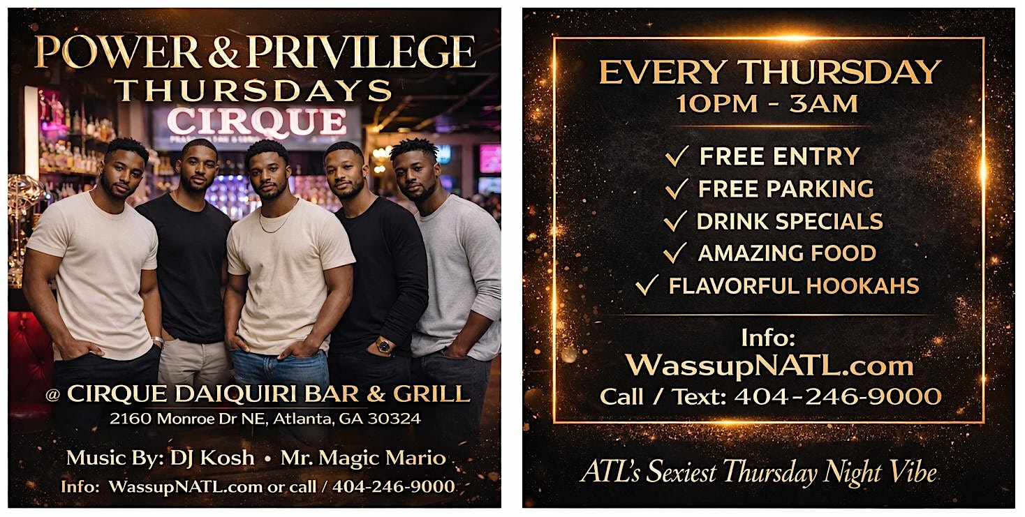 by admin13Feb POWER & PRIVILEGE THURSDAYS @ CIRQUE DAIQUIRI BAR & GRILL at Cirque Daiquiri Bar & Grill – Atlanta, GA POWER & PRIVILEGE THURSDAYS @ CIRQUE DAIQUIRI BAR & GRILL at Cirque Daiquiri Bar & Grill – Atlanta, GA 1 1 people viewed this event. POWER & PRIVILEGE THURSDAYS @ CIRQUE DAIQUIRI BAR & GRILL 2160 Monroe Dr NE, Atlanta, GA 30324 EVERY THURSDAY @ 10PM TIL 3AM – FREE ENTRY – Tickets-RSVP Link Date And Time Friday, February 20th, 2026 03:00 AM (PST) Venue Cirque Daiquiri Bar & Grill Location 2160 Monroe Drive Northeast, Atlanta, GA 30324 Event Types Food & DrinkParty or Social Gathering Event Category AtlantaGeorgia Share With Friends Facebook Twitter Linkedin Xing Pinterest Share This Post: