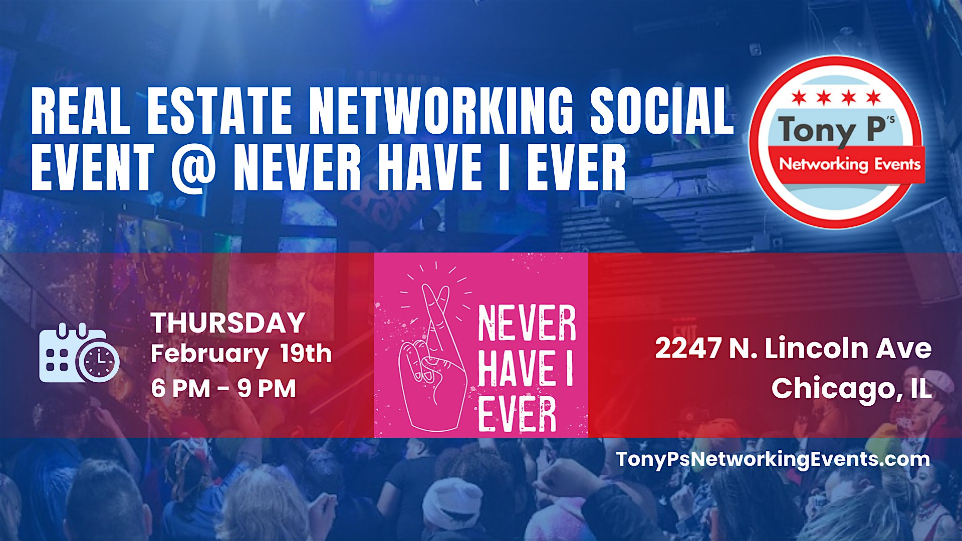 by admin12Feb Real Estate Networking Event @ Never Have I Ever: Thursday February 19th at NEVER HAVE I EVER – Chicago, IL Real Estate Networking Event @ Never Have I Ever: Thursday February 19th at NEVER HAVE I EVER – Chicago, IL 3 3 people viewed this event. Come join us, at Never Have I Ever, with over 150 of the Chicago area’s top Real Estate Industry Professionals! Tickets-RSVP Link Date And Time Friday, February 20th, 2026 12:00 AM (PST) Venue NEVER HAVE I EVER Location 2247 North Lincoln Avenue, Chicago, IL 60614 Event Category ChicagoIllinois Share With Friends Facebook Twitter Linkedin Xing Pinterest Share This Post: