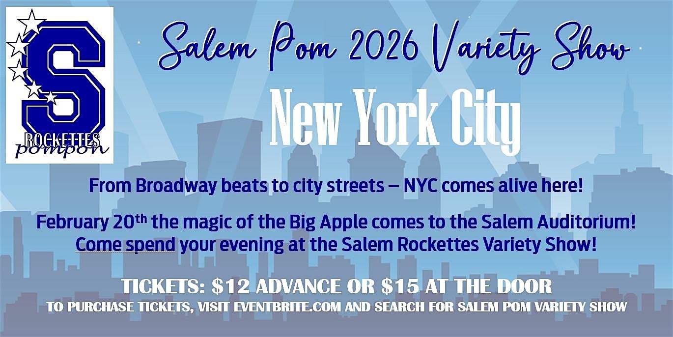 by admin12Feb Salem Pom Variety Show – 2026 at Salem High School – Canton, MI Salem Pom Variety Show – 2026 at Salem High School – Canton, MI 5 5 people viewed this event. Friday, February 20th @ 6:30pm, the magic of New York City comes to the Salem Auditorium for the 2026 Salem Pom Variety Show! Tickets-RSVP Link Date And Time Friday, February 20th, 2026 11:00 PM (PST) Venue Salem High School Location 46181 Joy Road, Canton, MI 48187 Event Types Concert or PerformancePerforming & Visual Arts Event Category Michigan Share With Friends Facebook Twitter Linkedin Xing Pinterest Share This Post: