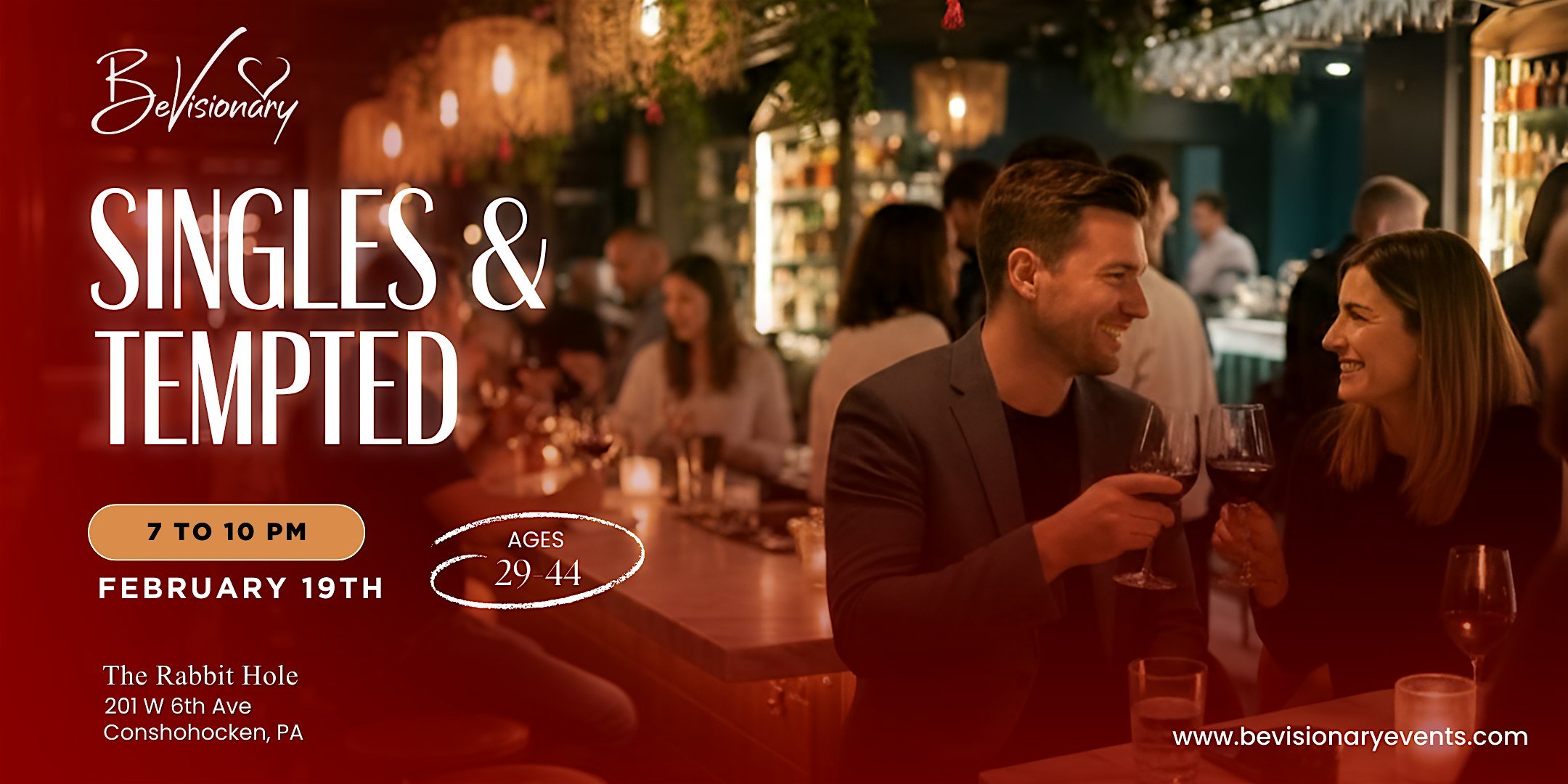 by admin12Feb Singles & Tempted at The Rabbit Hole – Conshohocken, PA Singles & Tempted at The Rabbit Hole – Conshohocken, PA 6 6 people viewed this event. ✨An upscale singles night for stylish ages 29–44—crafted cocktails, DJ vibes, flirty energy, and real connections at The Rabbit Hole. Tickets-RSVP Link Date And Time Friday, February 20th, 2026 12:00 AM (PST) Venue The Rabbit Hole Location 201 West 6th Avenue, Conshohocken, PA 19428 Event Types Party or Social Gathering Event Category Pennsylvania Share With Friends Facebook Twitter Linkedin Xing Pinterest Share This Post: