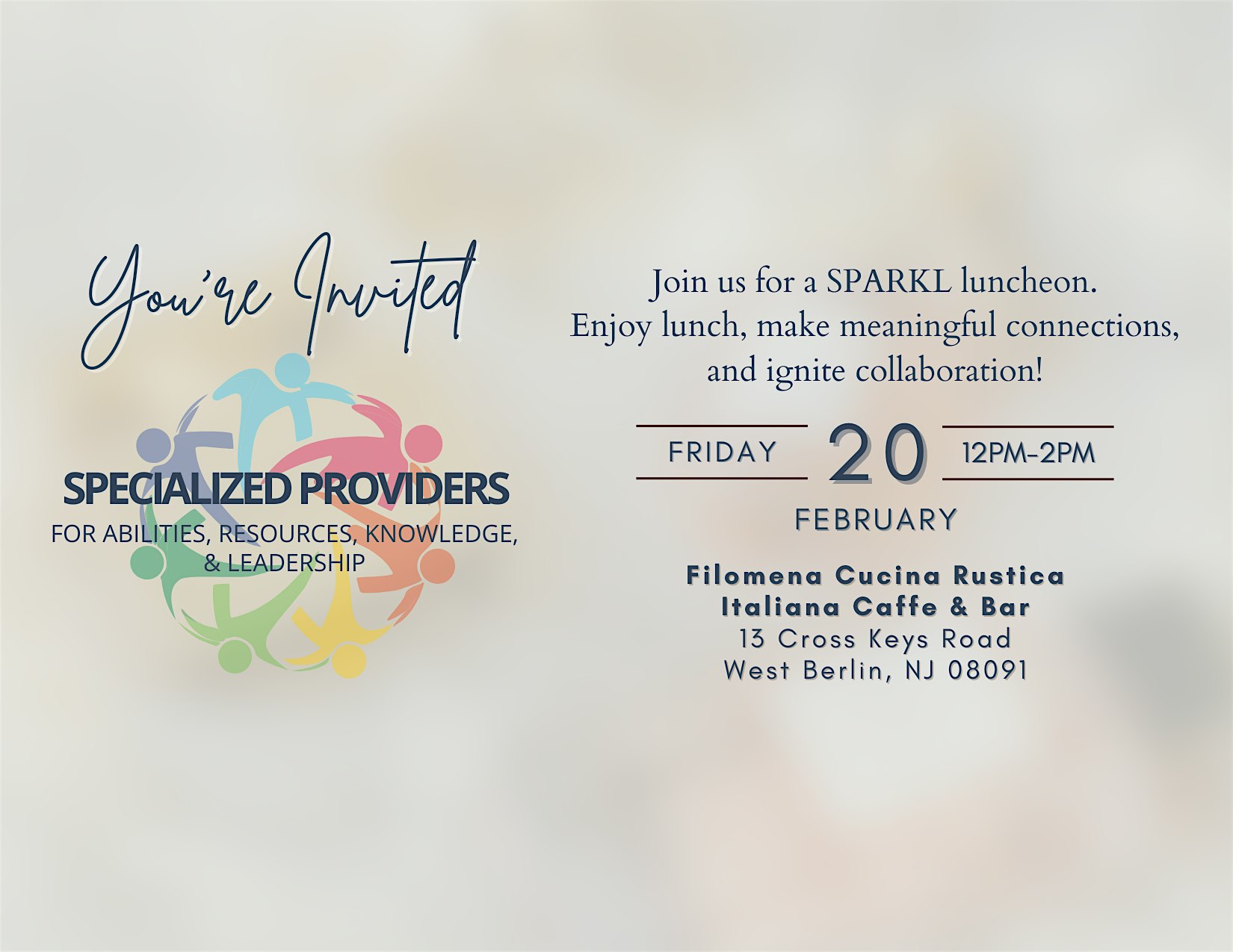 by admin12Feb SPARKL Winter Luncheon at Filomena Cucina Rustica – Berlin Township, NJ SPARKL Winter Luncheon at Filomena Cucina Rustica – Berlin Township, NJ 1 1 people viewed this event. Join us for a SPARKL Luncheon—enjoy lunch, make meaningful connections, and ignite collaboration! With Guest Speaker Genna Henhafer, BCBA!! Tickets-RSVP Link Date And Time Friday, February 20th, 2026 05:00 PM (PST) Venue Filomena Cucina Rustica Location 13 Cross Keys Road, Berlin Township, NJ 8091 Event Types Food & Drink Event Category New Jersey Share With Friends Facebook Twitter Linkedin Xing Pinterest Share This Post: