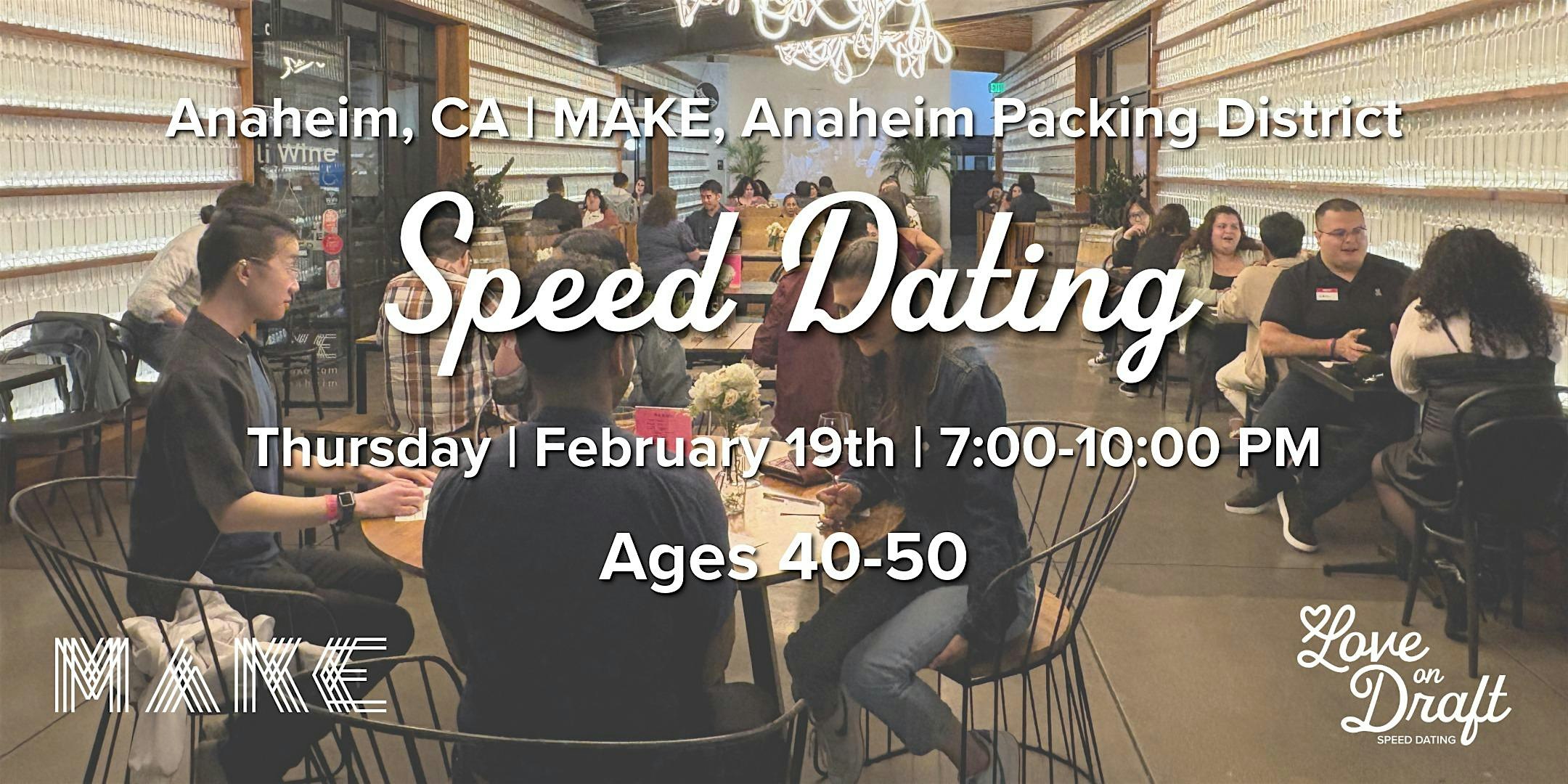 by admin12Feb Speed Dating | Ages 40-50 | MAKE | Anaheim Packing District at MAKE – Anaheim, CA Speed Dating | Ages 40-50 | MAKE | Anaheim Packing District at MAKE – Anaheim, CA 6 6 people viewed this event. Skip the dating apps! Join us for speed dating over craft beer, wine or cocktails and make real connections in a fun, face-to-face setting. Tickets-RSVP Link Date And Time Friday, February 20th, 2026 03:00 AM (PST) Venue MAKE Location 500 South Anaheim Boulevard, Anaheim, CA 92805 Event Types Community & CultureParty or Social Gathering Event Category CaliforniaLos Angeles Share With Friends Facebook Twitter Linkedin Xing Pinterest Share This Post: