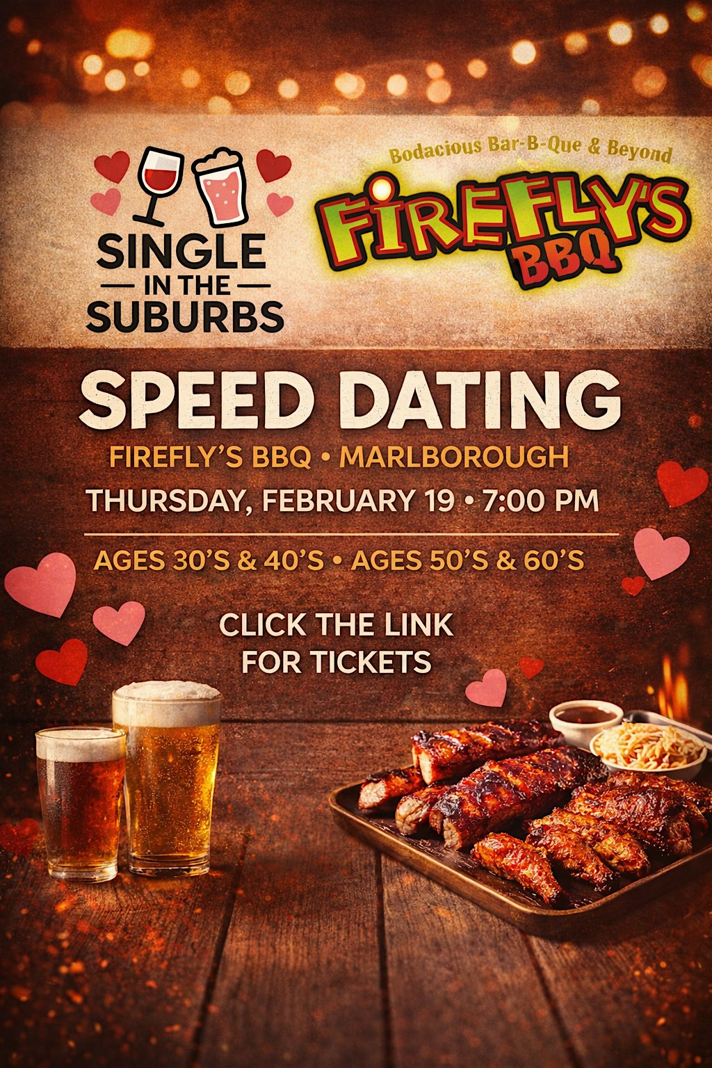 by admin12Feb Speed Dating at Fireflys BBQ in Marlborough **Two Age Groups** at Firefly’s BBQ – Marlborough, MA Speed Dating at Fireflys BBQ in Marlborough **Two Age Groups** at Firefly’s BBQ – Marlborough, MA 5 5 people viewed this event. Get ready to meet new people and maybe even find a spark at our speed dating event – who knows, you might just meet your match! Tickets-RSVP Link Date And Time Friday, February 20th, 2026 12:00 AM (PST) Venue Firefly's BBQ Location 350 East Main Street, Marlborough, MA 1752 Event Types Food & DrinkOtherParty or Social Gathering Event Category Massachusetts Share With Friends Facebook Twitter Linkedin Xing Pinterest Share This Post: