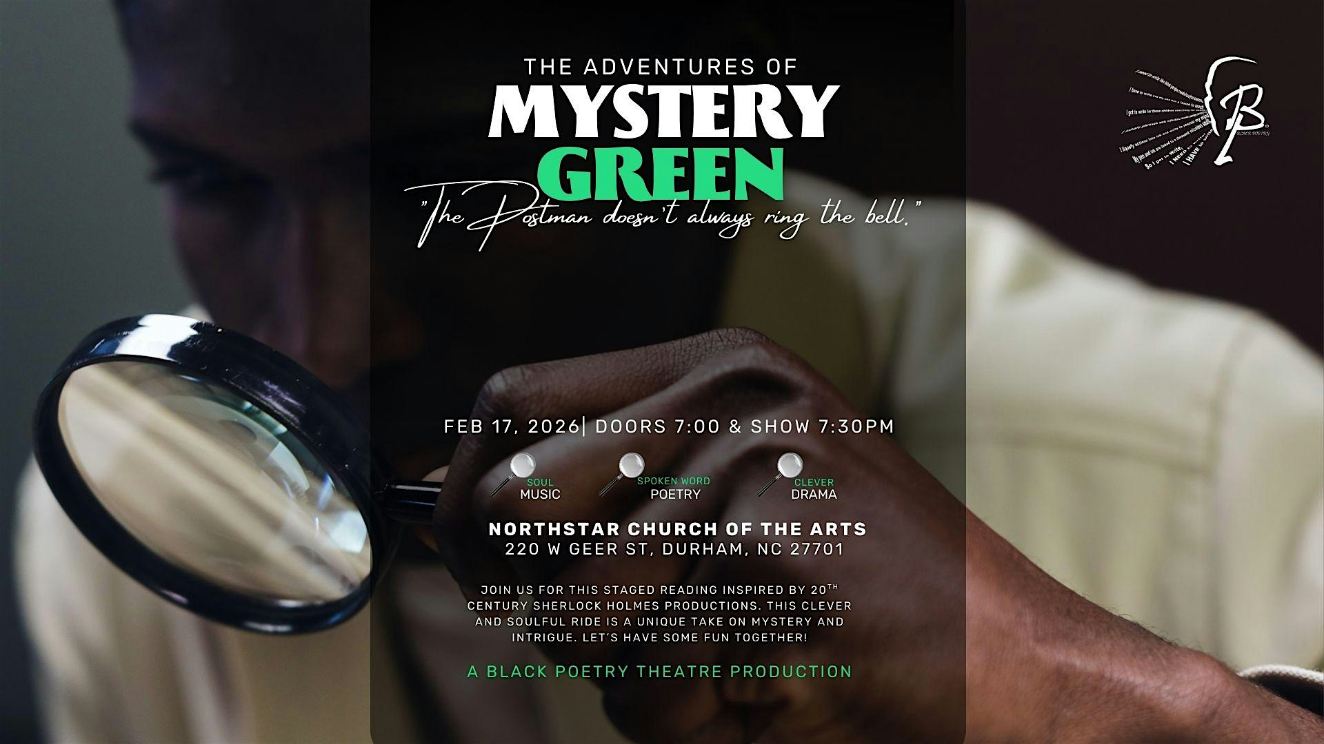 by admin12Feb The Adventures of Mystery Green at NorthStar Church of the Arts – Durham, NC The Adventures of Mystery Green at NorthStar Church of the Arts – Durham, NC 4 4 people viewed this event. A staged reading presented by Black Poetry Theatre Tickets-RSVP Link Date And Time Friday, February 20th, 2026 03:00 PM (PST) Venue NorthStar Church of the Arts Location 220 West Geer Street, Durham, NC 27701 Event Types Concert or PerformancePerforming & Visual Arts Event Category DurhamNorth Carolina Share With Friends Facebook Twitter Linkedin Xing Pinterest Share This Post: