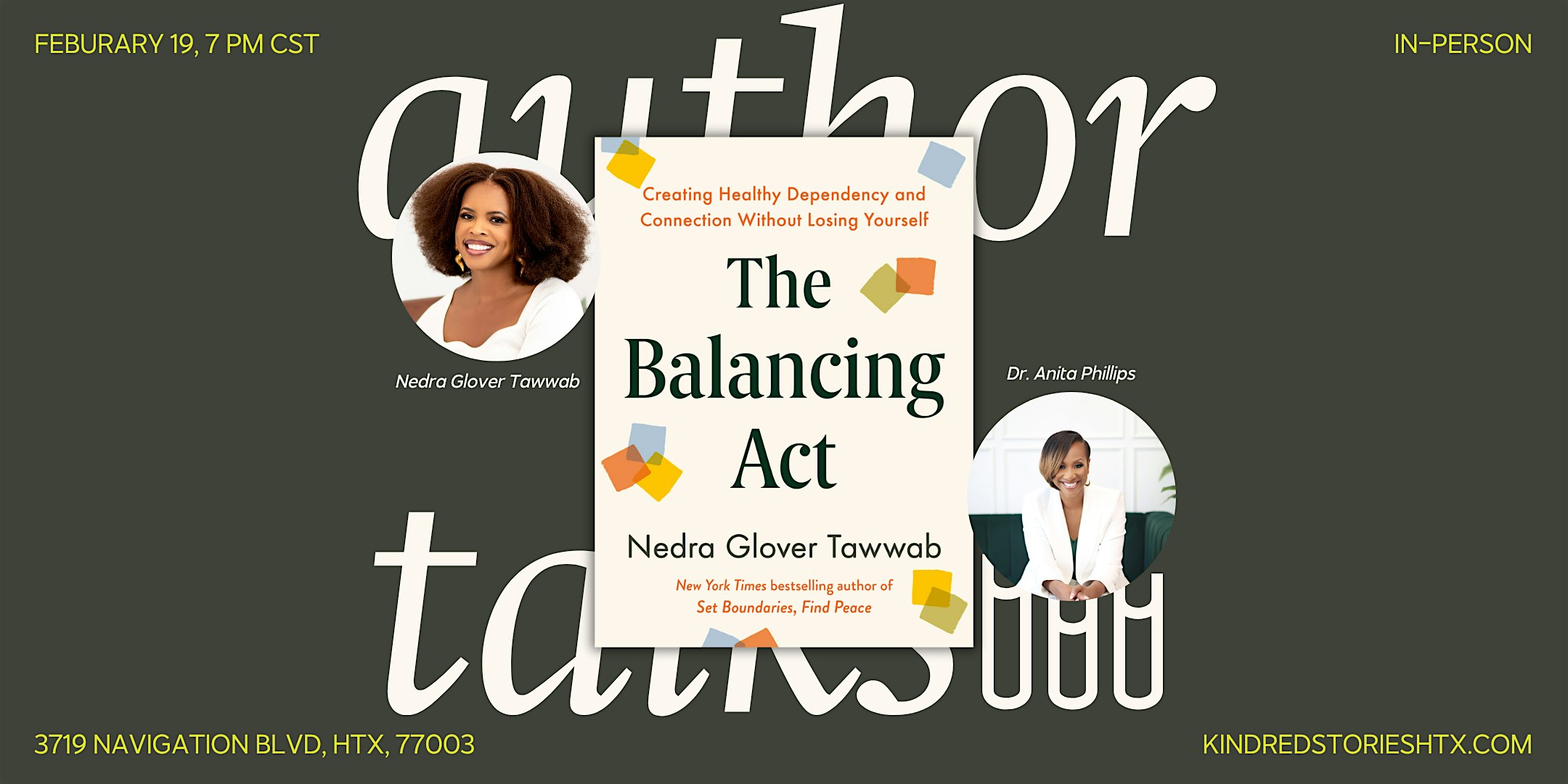 by admin12Feb The Balancing Act with Nedra Glover Tawwab at Holy Family HTX – Houston, TX The Balancing Act with Nedra Glover Tawwab at Holy Family HTX – Houston, TX 5 5 people viewed this event. Join us to celebrate Nedra Glover Tawwab’s latest release The Balancing Act . Tickets-RSVP Link Date And Time Friday, February 20th, 2026 01:00 AM (PST) Venue Holy Family HTX Location 3719 Navigation Street, Houston, TX 77003 Event Types Film, Media & EntertainmentOther Event Category HoustonTexas Share With Friends Facebook Twitter Linkedin Xing Pinterest Share This Post: