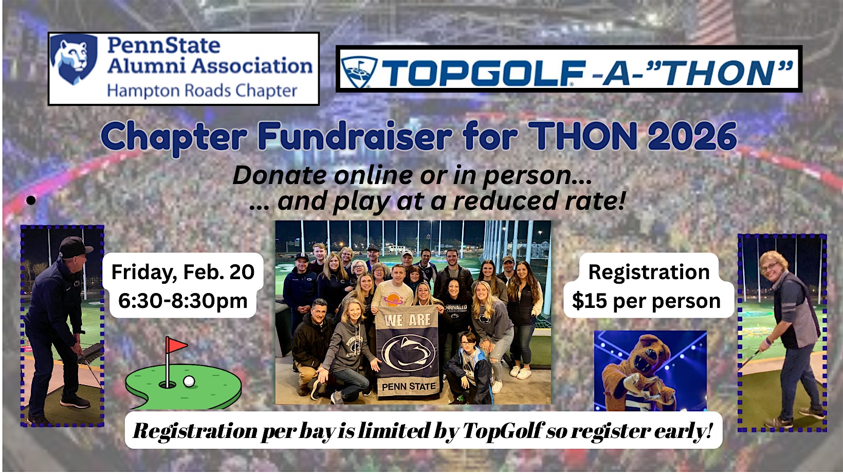by admin12Feb Top Golf-a-THON Fundraiser 2026 at Topgolf Virginia Beach – Virginia Beach, VA Top Golf-a-THON Fundraiser 2026 at Topgolf Virginia Beach – Virginia Beach, VA 6 6 people viewed this event. Kick off THON 2026 by contributing to the world’s largest student-run philanthropy through our Chapter! In person at TopGolf or online! Tickets-RSVP Link Date And Time Friday, February 20th, 2026 11:00 PM (PST) Venue Topgolf Virginia Beach Location 5444 Greenwich Road, Virginia Beach, VA 23462 Event Types Sports & Fitness Event Category VirginiaVirginia Beach Share With Friends Facebook Twitter Linkedin Xing Pinterest Share This Post: