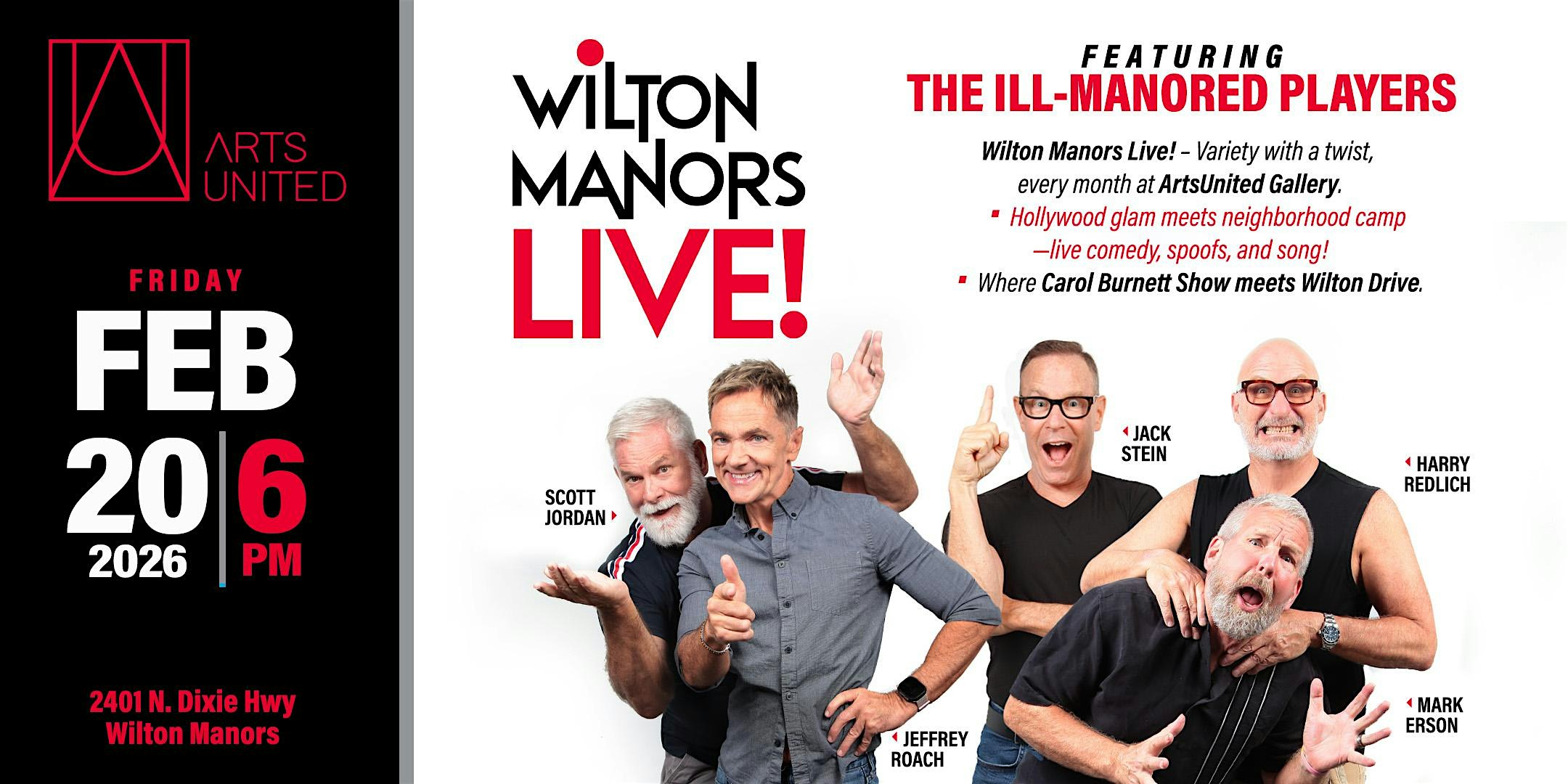 by admin13Feb Wilton Manors LIVE! @ArtsUnited Gallery / 2-20-2026 at 2401 N Dixie Hwy – Wilton Manors, FL Wilton Manors LIVE! @ArtsUnited Gallery / 2-20-2026 at 2401 N Dixie Hwy – Wilton Manors, FL 2 2 people viewed this event. Variety show with a twist, every month! Hollywood glam meets neighborhood camp—live comedy, spoofs, and song! Tickets-RSVP Link Date And Time Friday, February 20th, 2026 11:00 PM (PST) Venue 2401 N Dixie Hwy Location 2401 North Dixie Highway, Wilton Manors, FL 33305 Event Types Concert or PerformancePerforming & Visual Arts Event Category Florida Share With Friends Facebook Twitter Linkedin Xing Pinterest Share This Post: